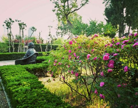 冰心纪念馆在烟台山公园的一处旧领事馆里,馆前也就是东南角有冰心的塑像,坐在椅子上,俯瞰烟台的东南面,塔山的塔尖也能看得真真切切。玫瑰花香袭人,真是一处世外桃源般的好地方。