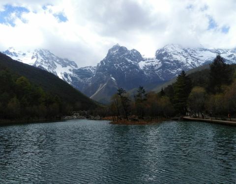 听涛湖是雪山脚下蓝月谷最里面的一个湖泊,湖水不是很深,但是水流声却沙沙作响,可能是因此所以取名为听涛之意把。 走到这里需要经过一条500米左右的栈道,沿路都是湖水和山川相伴,风景很好。 因为我觉得不是很远,所以建议不要坐电瓶车。