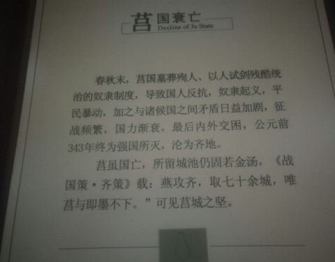 吃饱喝足接着参观莒州博物馆。很值得一看。最古老的文字。春秋时期的莒国故城(复原图)吃饱喝足接着参观莒州博物馆博物馆馆藏非常丰富,金缕玉衣、生殖图腾铜器、大量有奇怪符号的古陶等等,有许多地域特征极强的文物,甚至极有研究价值的孤例珍品。很值得一看。莒州博物馆大厅主题墙博物馆里光线暗...吃饱喝足接着参观莒州博物馆博物馆馆藏非常丰富,金缕玉衣、生殖图腾铜器、大量有奇怪符号的古陶等等,有许多地域特征极强的文物,甚至极有研究价值的孤例珍品。很值得一看。莒州博物馆大厅主题墙博物馆里光线暗,我的拍照水平也有限,照片虚了就不上了,上几张清楚点的。
