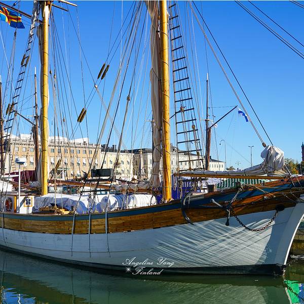 Etelaesplanadi大街走到尽头是一个小广场,广场上是波罗的海的女儿的雕像,而热闹的对面就是赫尔辛基最大的露天市场,有海鲜,有水果和各种手工艺品。在水果摊驻足停留的片刻,一位穿着考究的赫尔辛基大爷还教我念这种红色的果子怎么念,说这几种都是当地最常吃的。有几个支起的大帐篷是吃饭的落脚点,跟我们中国的大排档差不多,主要的食物是小土豆,烧蔬菜和其它一些鱼类产品,份量实在,一人一份吃下去完全会被撑到。芬兰的男人女人长得都很俊俏,嗯,是的,五官端正棱角分明比较男性化的感觉,当然偶尔还是会见到一些妖孽的,哈哈哈。芬兰人好像特别喜欢染头发,马路上到处都是理发店,可能因为他们的发色都是白色浅黄色比较好染吧,不像我们黑头发还要先漂白。露天集市的边上停泊着非常多的船舶,好多都是古老的帆船,最靠岸的那排船上也都是售卖海鲜的。不远处可以看到高高的摩天轮和一些抛锚着的大邮轮。之后我们再回赫尔辛基的那天就是从码头这里买了去爱沙尼亚的船票登轮出发的。