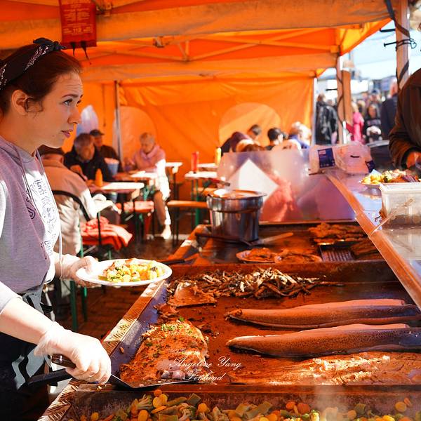 露天市场的卖鱼师傅,露天市场就在波罗的海的女儿雕像旁边