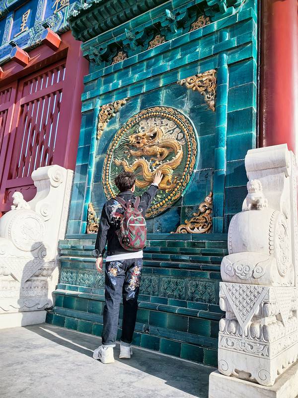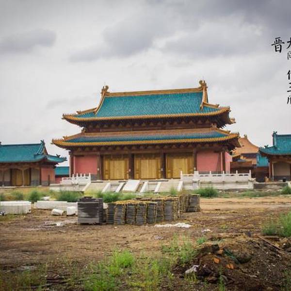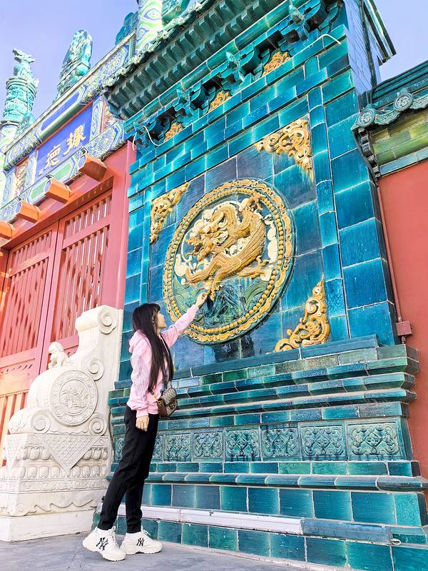 大同古城的中心是四牌楼,鼓楼组成的中轴线,几乎所有的明清古城其实都是这种四方格局,古城里主要的景点大部分集中在中轴线的西侧,唯有九龙壁和正在修建的代王府位于四牌楼西侧。在四牌楼环岛东北角,是正在复建的大同代王府。代王府始建于1392年,于明末战乱时被烧毁,唯独幸存的是府前的照壁,也就是有名的大同九龙壁,国内三幅九龙壁中最大的一个。偷偷从门缝中照的代王府,亲王级的青绿色琉璃瓦覆顶,墙柱是粉红色,复建的非常讲究。其实故宫中的一部分殿宇在明朝时也是这种淡红色,比满清的大红大金秀气多了。