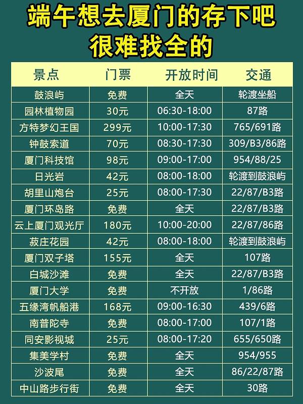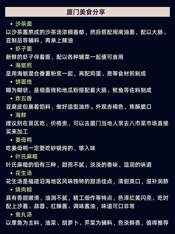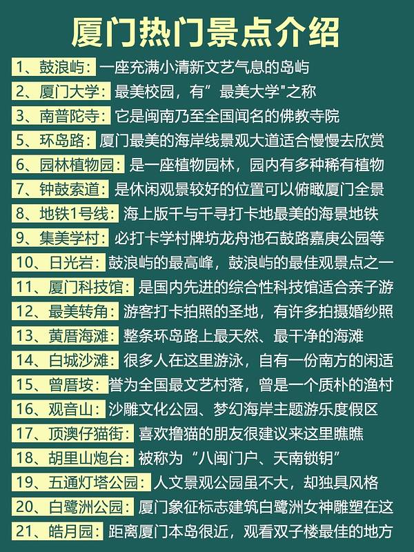 总而言之,厦门是一个值得去一次又一次的美丽城市,这里不仅有着漂亮的风景,美食繁多,还有很多值得一游的文化景点。如果你有机会来这里旅游,别忘了关注我的攻略哦!#厦门[话题]# #厦门旅游攻略[话题]# #旅游推荐[话题]# #小众景点[话题]# #自驾游[话题]#