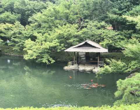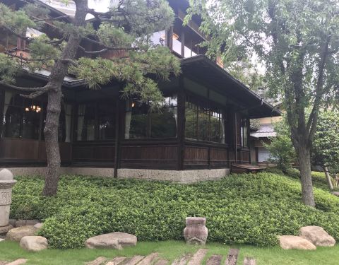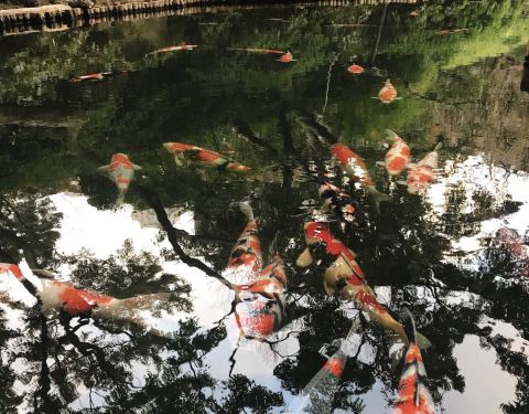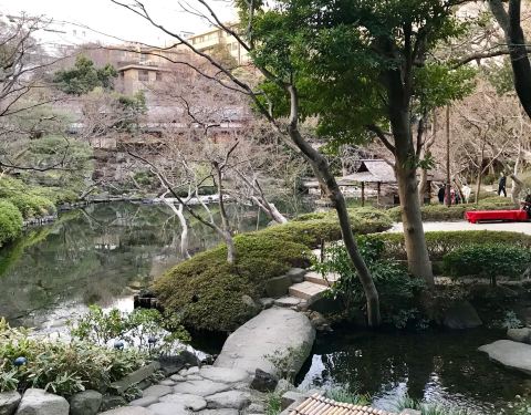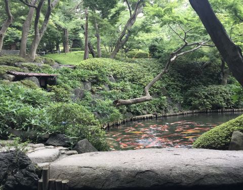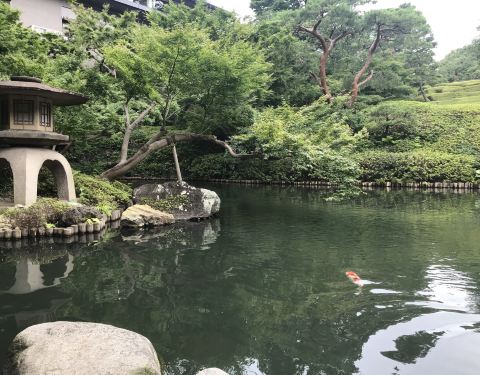 锦鲤特别漂亮。不需要门票,里面是个大的宾馆,周末有许多人结婚,幸运的话能看到日式婚礼。里面的庭院是典型的日式庭院,古树盆栽几乎都有上百年的历史,值得一看。