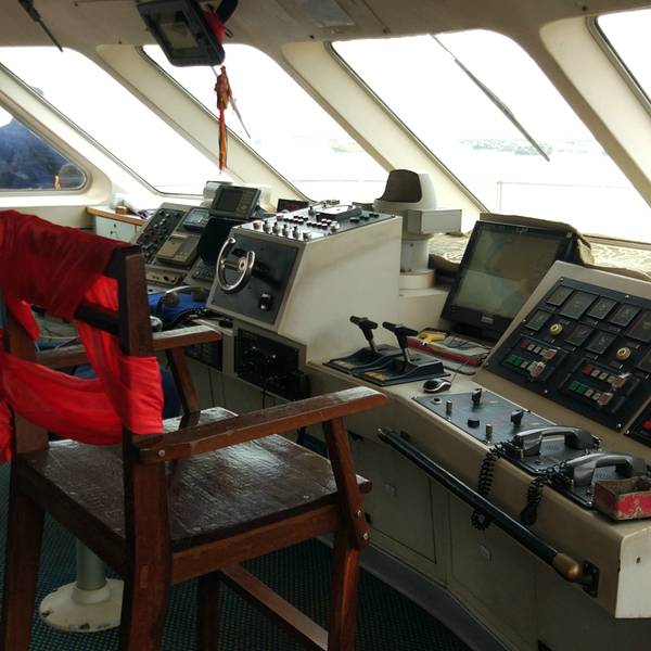 因为船票是托熟人买的,所以到了码头很快就能上船啦。驾驶舱KTV包厢船上一共分了三层,第三层是风景最好的,但要120元一张台5个座位。也有KTV包厢,但应该没人上船就是为了唱几首歌吧。。。所以果断拿了一张桌子。