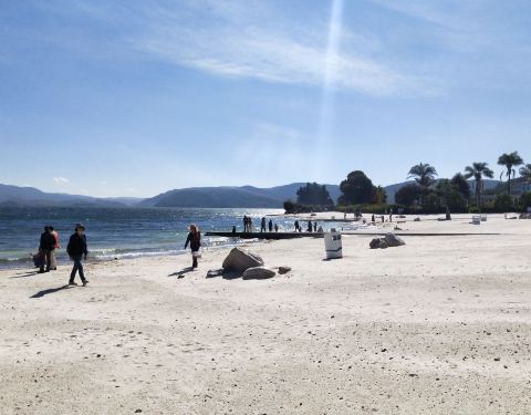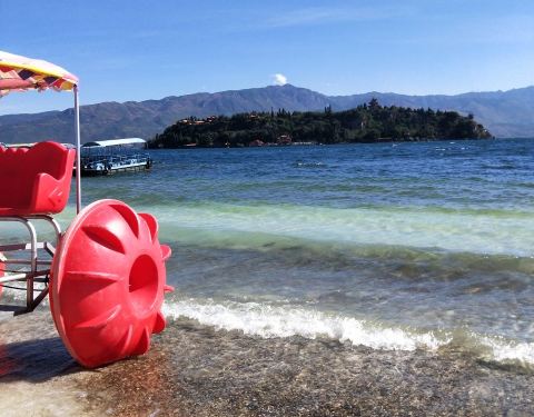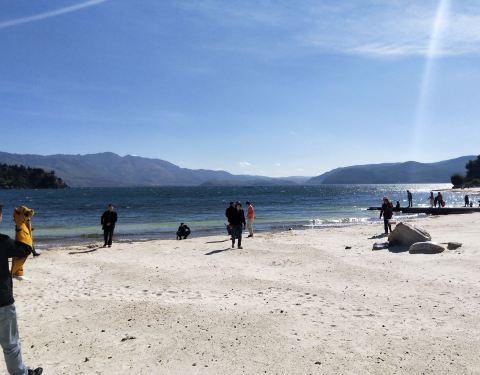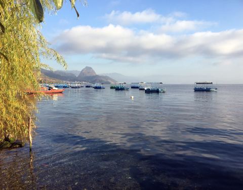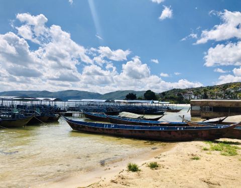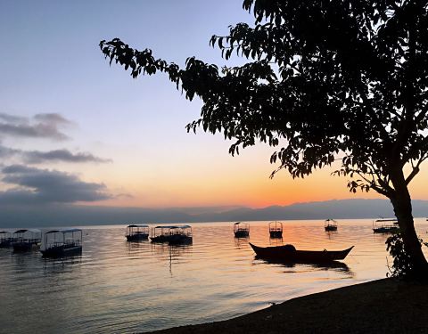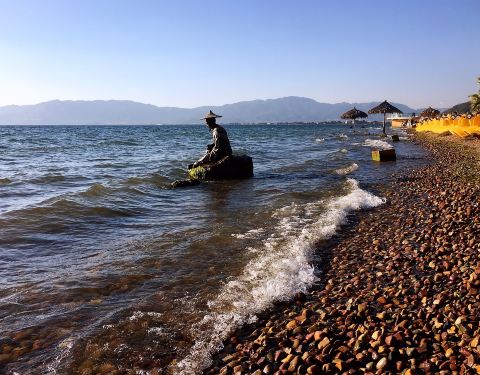沿着湖岸几十公里环游,在一处停下来。走近湖边,湖水清澈明亮。在风的吹拂下,湖水荡漾击打着船舶和沿岸。湛蓝的天空,朵朵型色各异的云朵;把整个天空呈现出活泼的气质。令人恍惚觉得抬手即可触碰到朵朵白云。湖边有几个小贩,叫卖着薯饼和虾饼。如此美好的景致,缺失的是湖边、沙滩的规划。没有可以遮阳或者小憩的桌椅和设置。十月中旬的阳光和紫外线依旧强烈,湖边的铁皮船在相互撞击着与湖面嬉戏。