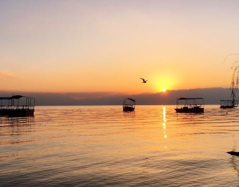 仙,宛如仙境; 抚仙湖的空气清新,就是一个天然的大氧吧,特别是清晨,每次呼吸都是在深度洗肺随着车上播放李健的抚仙湖“转眼天已蒙蒙亮,昨夜不知了去向,抚仙湖水在荡漾,只是没人再惆怅,自带仙气的抚仙湖已进入视线,此刻坐拥在青山环抱中的抚仙湖水平如镜、柔和妩媚;抚仙湖很美,但却很低调,微风拂...随着车上播放李健的抚仙湖“转眼天已蒙蒙亮,昨夜不知了去向,抚仙湖水在荡漾,只是没人再惆怅,自带仙气的抚仙湖已进入视线,此刻坐拥在青山环抱中的抚仙湖水平如镜、柔和妩媚;抚仙湖很美,但却很低调,微风拂水,此时湖面如锦缎,特别是夕阳西下时,嵌有金丝的红丝缎铺满湖面,伴随天空中那淡淡的云,周围花草那幽幽的香,美到极致,让原本浮躁的内心得到片刻的安宁,静静享受这段柔美的时光;多了一份豁达,多了些许平和。 清晨醒来,打开窗帘,东方微微泛红,躺在床上,窗外目之所及,是湖水碧波万倾,隐约可见湖上那泛着青烟似的薄雾,却无法辨出灰色的是远山还是晨云,眼前偶有海鸥从水面飞过,耳边似有水声在荡漾,我喜欢这幸福悠闲时光;和着远山和湖水的心跳,也有范仲淹登岳阳楼那心旷神怡,宠辱偕忘,虽未把酒临风,却实实在在的喜洋洋也。幸福之时,湖面似有霞光射出,我快速完成洗漱穿戴 ,赶在太阳射出万丈光芒前,冲出房门,来到湖边静待阳光普照湖面。 清晨的寒风,阻止不了太阳高升,也拉扯不住我赏日的热情,我默默的呼唤“太阳!太阳!太阳公公出来吧”,果然,太阳终于用尽全力挣脱了大地妈妈的怀抱,带着母体的血红跃上了天际;海鸥惊喜鸣叫,抖着翅膀穿梭翱翔;湖水惊喜闪烁,披着红纱波澜壮阔,云朵惊喜翻腾,舒展衣裙曼妙起舞,我也惊喜拍照,记录着大地苏醒,红光普照,色彩斑斓。 抚仙湖的空气清新,就是一个天然的大氧吧,特别是清晨,每次呼吸都是在深度洗肺;眼前这一汪碧蓝碧蓝的巨大湖泊,星星点点的各式小舟在湖面上飘荡,向房东申请荡舟湖中,房东爽快的答应了,竟是30元不限时;房东踩着一叶小舟,把自家远处的脚踏船拉过来,我们轻松的泛舟于湖上,沐浴在晨曦的抚慰中,矗立于船头,举目环顾那连绵无尽的群山,垂首凝望那柔和莹透的湖水,此时,偌大的湖面,可视范围内,只有我这舟缓慢的游荡,淡季呀!我独享抚仙湖。仙,宛如仙境;梦,如痴如梦。 展开