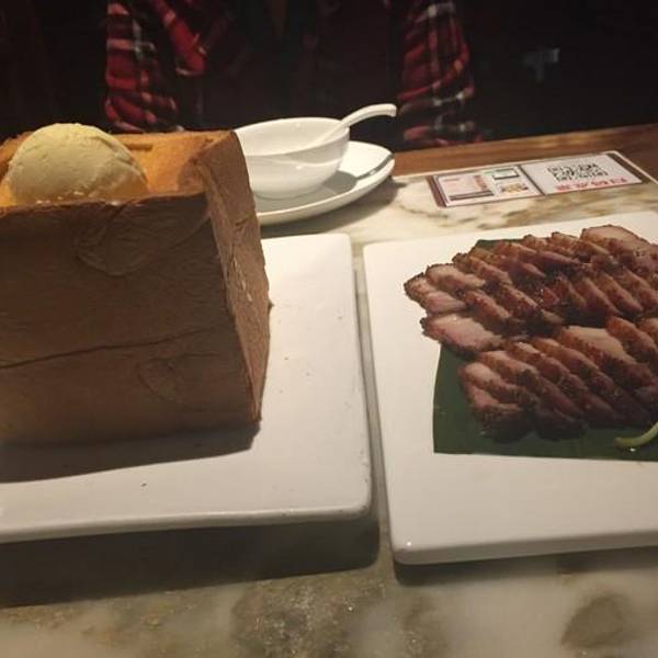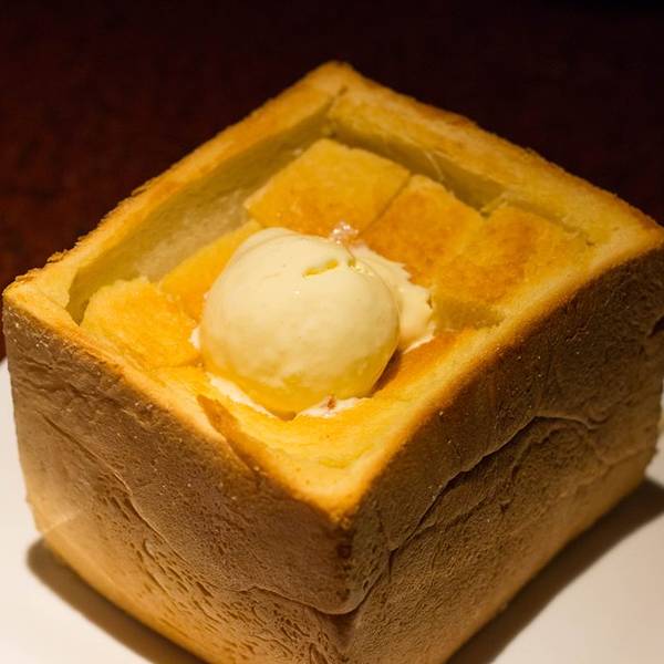 推荐面包诱惑,一个方型大面包表皮烤得焦脆,面包心切成若干小方块,上面再放两球冰琪琳,面包皮的焦...