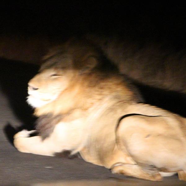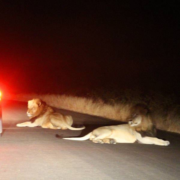 斑鬣狗虽然体型很小,但却凶猛无比,可以捕食斑马、角马、斑羚这类个头儿比他们本身大不少的动物,成群结队甚至可以和狮群抗衡。《狮子王》里的反派就是他们。眼看着就要到10点了,我后排的小朋友已经在爸爸的怀里睡着了。就在大家失望之极的时候,突然路边出现两只狮子!全车都沸腾了,又兴奋又紧张,司机反复小声提醒,千万不要用手电去照狮子的眼睛,否则很容易激怒他们。