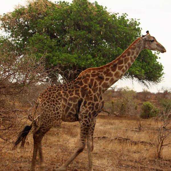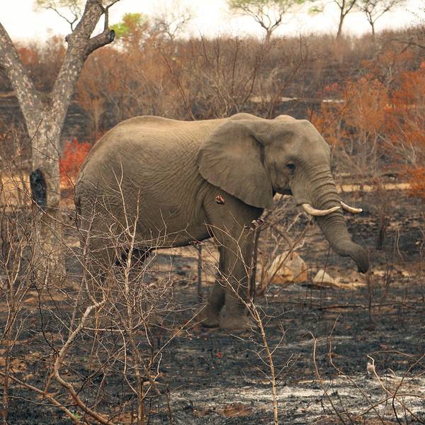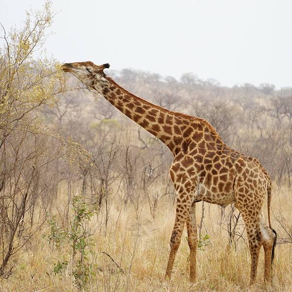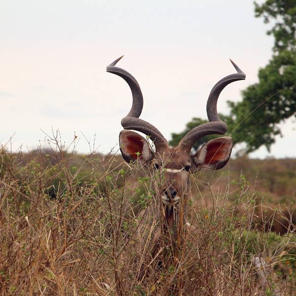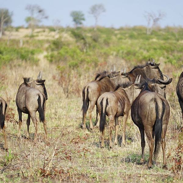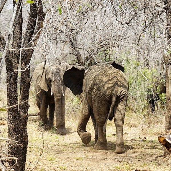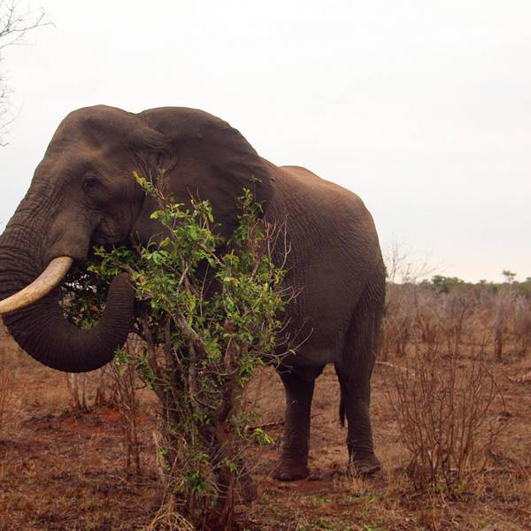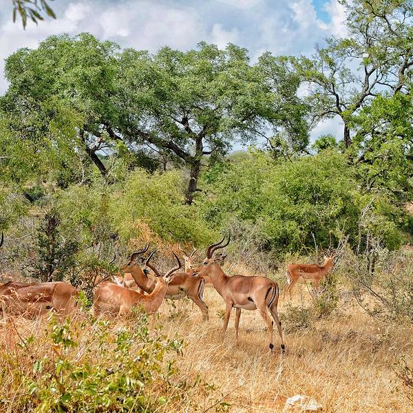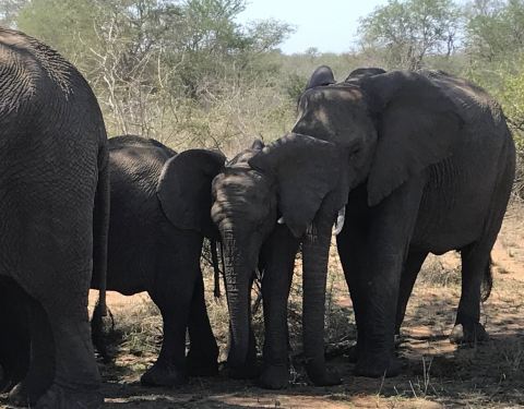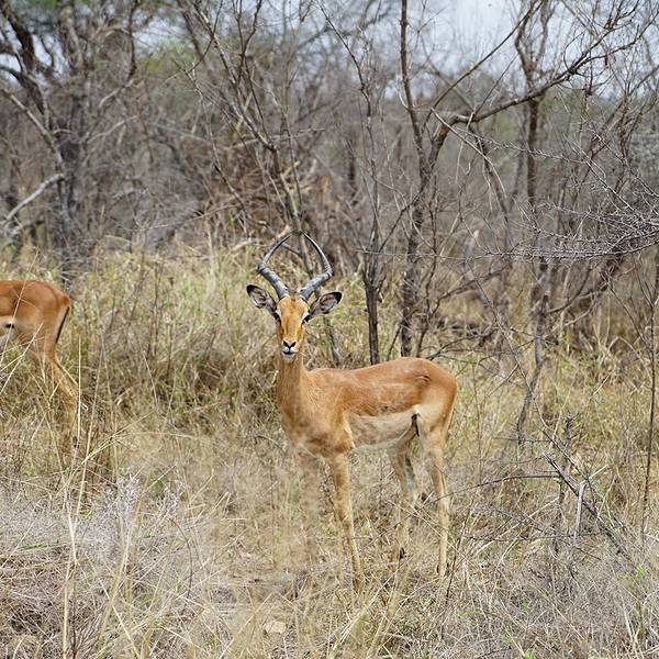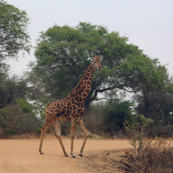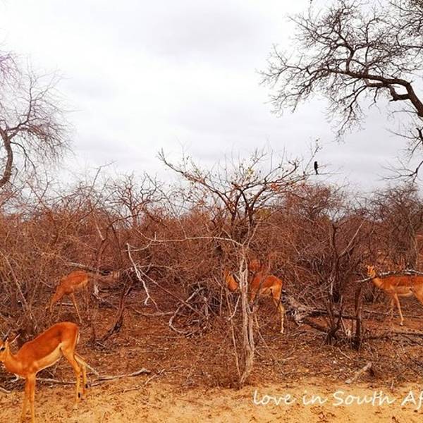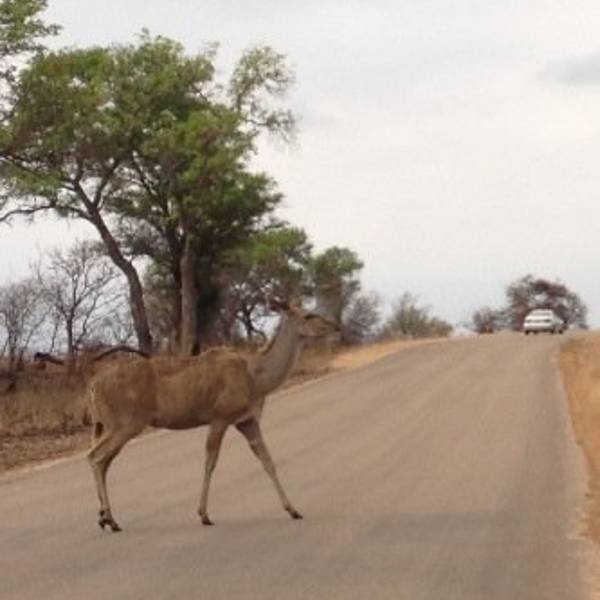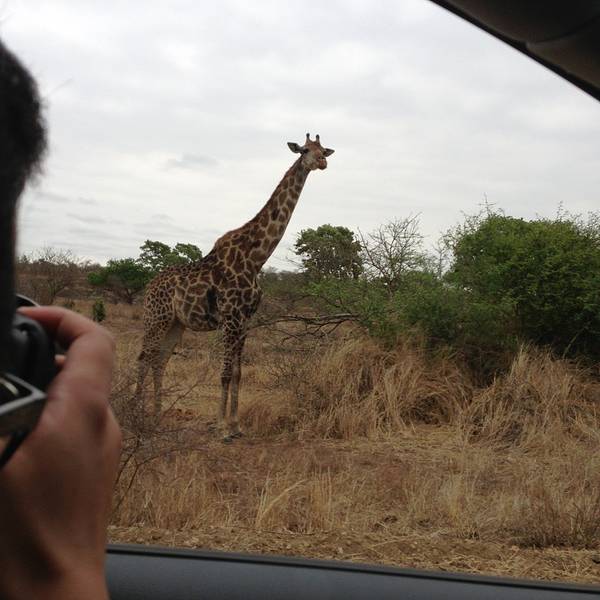 继续出发,一群又一群的黑斑羚在路边出现,它们或站或卧,有的呆立在路边和你四目相对,有的听到点风吹草动就慌张地往灌木丛深处跑去。我们也从一开始看到黑斑羚兴奋不已,尖叫、停车、拍照,到后来的直接视而不见地路过了。捻羚大概是除了黑斑羚以外第二常见的动物了,体型比较大,成年雄性有长长弯弯的角而显得特别优美。大象也常常不经意地就出现在路旁,通常是几只一起,风卷残云地剐蹭树皮、撕扯树枝。我们一路看到的象体型都偏小,但听说在野生动物园里最不要招惹的就是大象,他们比狮子豹子更危险,可以轻松掀翻你的汽车。长颈鹿因为特殊的身高优势,远远地就能被发现,他们咀嚼树叶的样子实在是太好玩儿了,上下颌一动一动的,呆萌感十足。整个白天看到的几乎都是食草动物,离狮子最近的一次是看见路边停了一长串汽车,此景象意味着必有珍禽猛兽出没。
