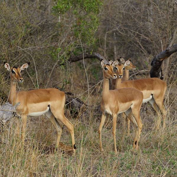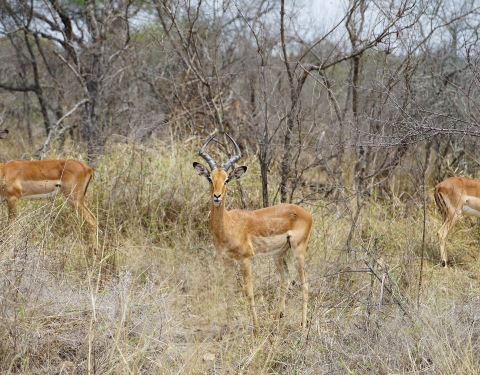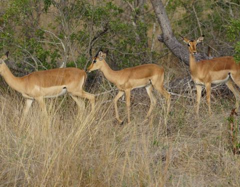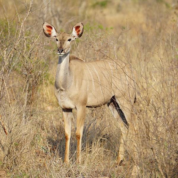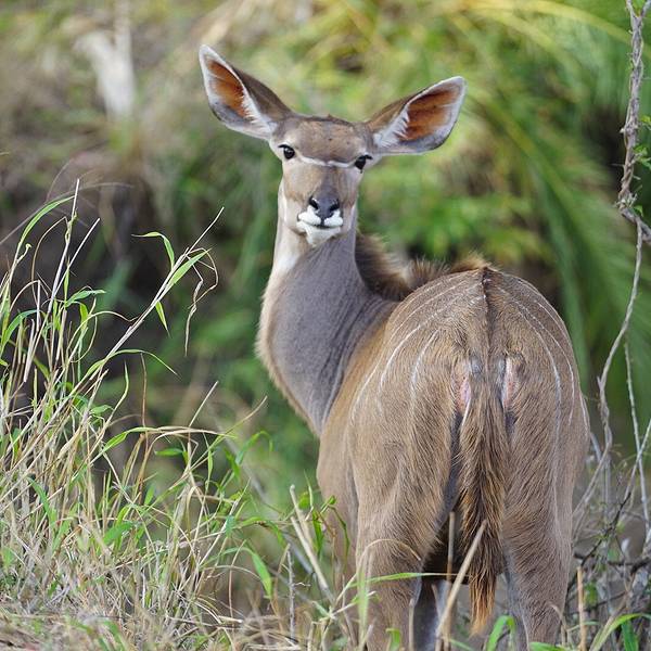 如何快速找到长颈鹿?在一片树林中观察哪颗树的树冠在抖动,长颈鹿进食时树冠是会抖的。如何分辨各种羚羊?一开始我们看到有角像羊的都叫羚羊,但听向导介绍时是三个不同的英文单词:Impala、waterbuck、kudu,仔细观察,公的都是有长角,母的没有,Impala屁股上有黑色的川字纹,Waterbuck脖子和屁股上有一圈像白色围兜的毛,Kudu身上有一条条的白色条纹。