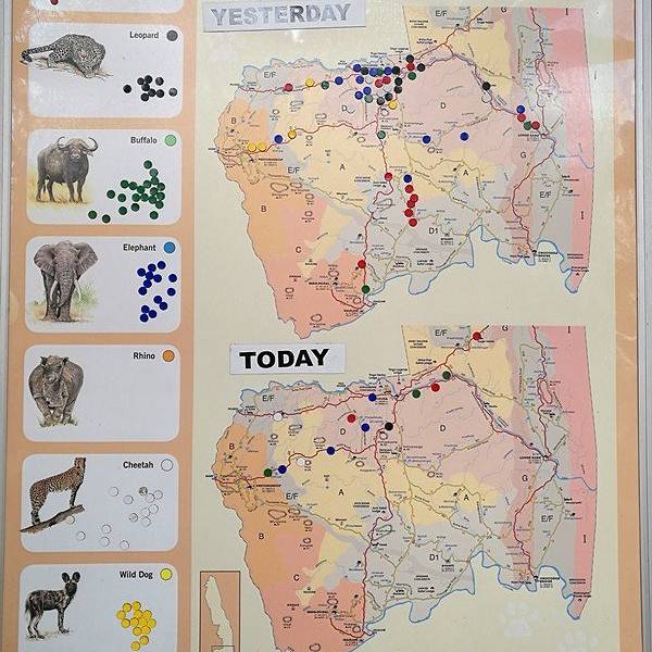 各个营地都有一个张贴栏,游客们会把他们看到的big five标注在地图上,方便大家参考。但动物毕竟是不停活动的,也只能看个大概范围。 展开
