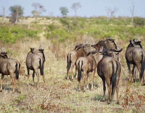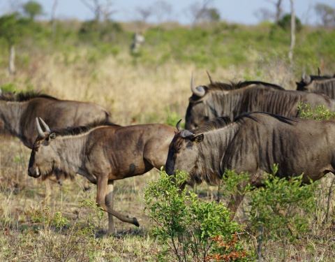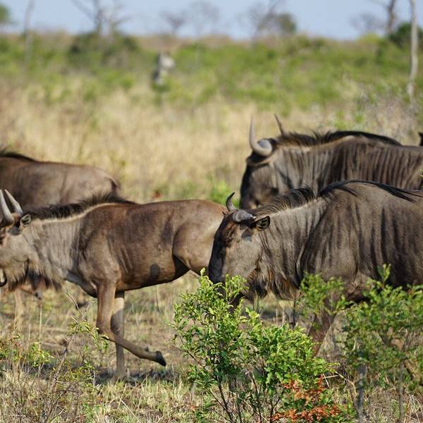 ImpalaWaterbuckKudu角马和斑马总是组团出现,形影不离。因为斑马喜欢吃草的上半部分,而角马喜欢吃草的下半部分。当斑马从草原上走过以后,草原上的草,就只下下半部分了,而随后跟上的角马,正好很方便地吃到它们喜欢的这部分。所以斑马和角马加在一起,就像一部割草机一样,它们经过的地方,草都被吃得干干净净。平原斑马和我们常见的动画片里的黑白斑马略有不同,中间多一条棕色的条纹。角马长得很特别,像马又像牛,自带ps效果,拍出来的照就像p过,动物大迁徙的主角就是它。下午猎游时会有Happy Hour,向导提前准备好各式饮料酒水和小吃,在户外食用。每天这个时刻是最放松的,周围也可能会有野生动物出现,但不会有危险,强烈推荐大象酒配咖啡,这是同车的南非人推荐给我们的,大象酒是南非特有的植物酒,和百利甜味道很像。每天也只有这个时刻可以下车凹个造型拍拍人像。猎游前最好先去洗手间,如果过程中有三急的话,只能和我一样在happy hour时找个草墩解决了,在大型动物围绕的营地里,走向草墩的背影竟然有种悲壮的感觉。猎游及拍摄Tips: