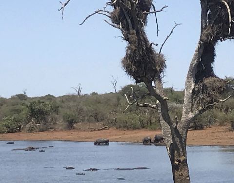 餐厅临河而建,视野开阔,中午天气热,动物们整好聚集在河边喝水,远远地看去有大群的河马、犀牛、羚羊,还有很多水鸟。
