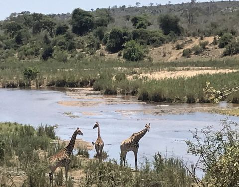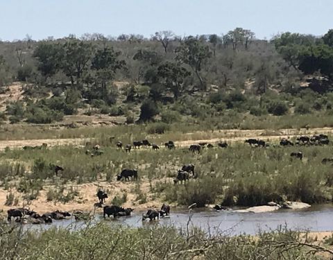 我之前想象中的克鲁格,是东非大草原那样的一望无际,远远地就能看到动物们成群结队、浩浩荡荡的场景。但做了功课后发现,实际情况是,克鲁格公园是以灌木丛和稀树草原为主,有一条sabie河以及一些浅滩,整体来说视线阻挡比较严重,不能看到肯尼亚坦桑尼亚那种广阔无垠的草原风光,但也是别有一番风味。