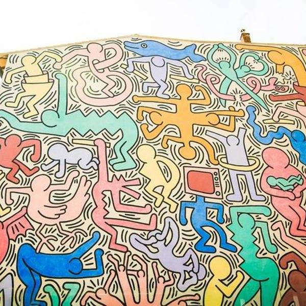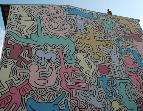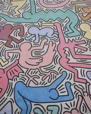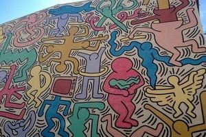 我们在去往火车站的路上经过了凯斯哈林壁画,壁画画在圣安东尼修道院180平方米的墙上,壁画的主题...我们在去往火车站的路上经过了凯斯哈林壁画,壁画画在圣安东尼修道院180平方米的墙上,壁画的主题是世界和平,看起来像很多个人。