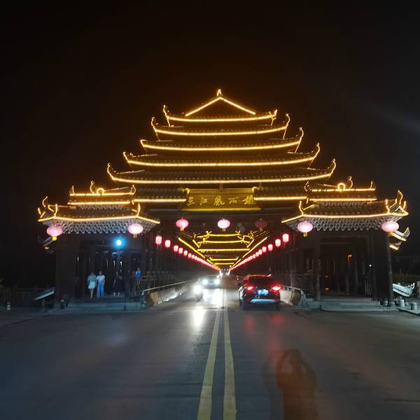 三江风雨桥挺长的一条风雨桥,挺漂亮的一座桥,在桥头路中间还专门设了拍照的地方三江风雨桥挺长的一条风雨桥,挺漂亮的一座桥,在桥头路中间还专门设了拍照的地方。桥上设置了很多装饰灯,晚上在灯光的照射下,就更好看了。