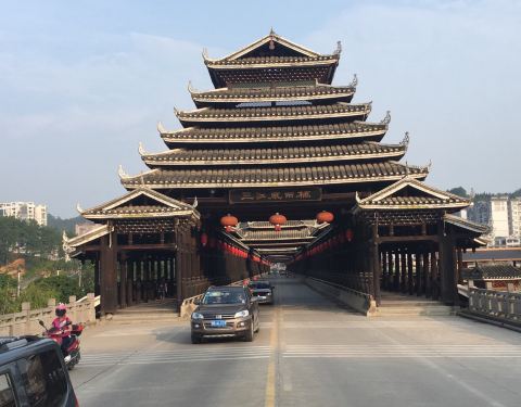 在月亮街闲逛,大概步行15分钟左右就可到达三江风雨桥。除了车路,两边是人行通道在月亮街闲逛,大概步行15分钟左右就可到达三江风雨桥。除了车路,两边是人行通道。侗族的木造结构的外观是它的特色,也是游客必到的景点。