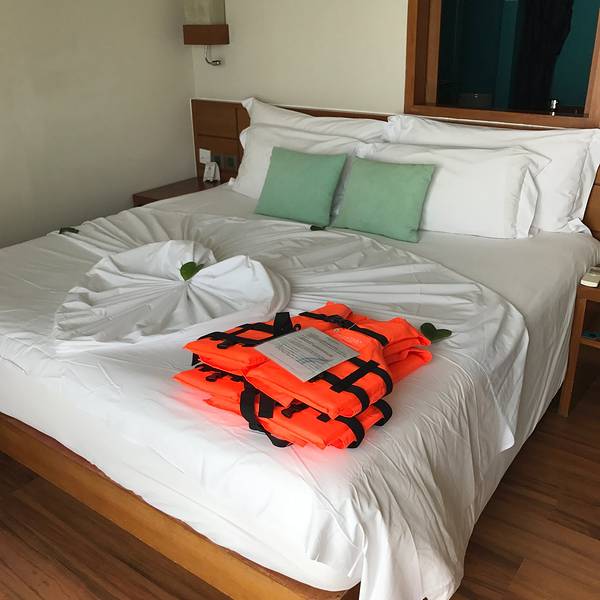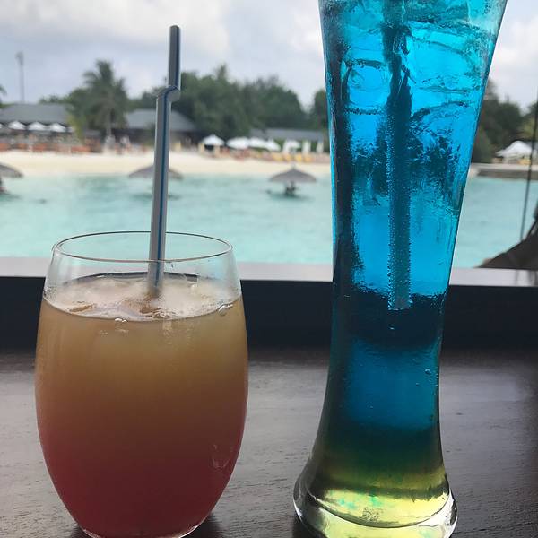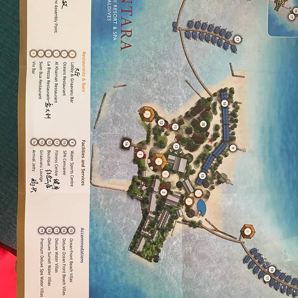 岛上的地图,很小的岛,走一圈也就20分钟吧。上岛之前有几名工作人员在接待,非常热情快艇将近二十分钟到了岛上。上岛之前有几名工作人员在接待,非常热情。进到前台以后,每个人发了一条凉凉的擦脸巾,还有一杯饮品,不知道什么名字,很好喝。中文的工作人员帮忙办理入住,然后开着小车把我们带到...快艇将近二十分钟到了岛上。上岛之前有几名工作人员在接待,非常热情。进到前台以后,每个人发了一条凉凉的擦脸巾,还有一杯饮品,不知道什么名字,很好喝。中文的工作人员帮忙办理入住,然后开着小车把我们带到房间。岛上的植被我感觉还是很丰富的,之前有评价说2013年翻修,很多植被被破坏了,我看还是很茂盛的。🌳床🛏很大很软,给了两个救生衣。每天配备两瓶饮用水,根本喝不完,因为都去酒吧喝鸡尾酒🍸果汁啦!虽然领证过了一年,但是还是贴心的送了蜜月套餐,红酒🍷点心巧克力🍫,还有小卡片。👍🏻岛上的地图,很小的岛,走一圈也就20分钟吧。中文的餐饮介绍,四个餐厅三个酒吧。我们住的房间,四晚都在这里,每天去餐厅酒吧小黑都会问房间号,他们three的发音很奇怪。🤓收拾好东西就换衣服去酒吧喽!🍸Viu Bar 这几天呆的最久的地方。Blue ocean 好看又好喝,另外一个没记住,有一页都是不含酒精的鸡尾酒,除了含pineapple 的,我觉得都挺好喝。菠萝🍍的味道好奇怪,不知道为什么,可能品种不一样。房间出来走3分钟,就到酒吧。因为是一价全含,所以大部分软饮料果汁都是免费的,如果自己点,都要6.7美元,再加上税,我的天🤑 展开