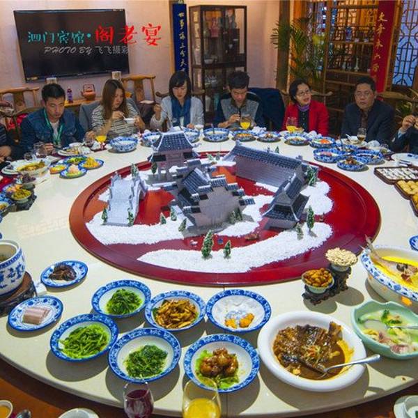泗门阁老家宴形成于明代中期,为明代贤相、太子太傅谢迁所开创。谢迁于弘治年间入阁任大学士,民间尊称谢阁老。故称阁老家宴。谢迁任上上表请诛权阀刘瑾,失败后回到了余姚泗门老家,深居简行。待五年后刘瑾伏法,谢迁因人望得以复职,慕贤者之名而来拜访的宾客络绎不绝。大食客谢迁在迎来送往中对原先的普通家宴进行改良和创新,并逐步行程了一套完整的宴席体系。被后人称为是“阁老家宴”。这样的盛宴对吃货来说绝对是致命的诱惑。