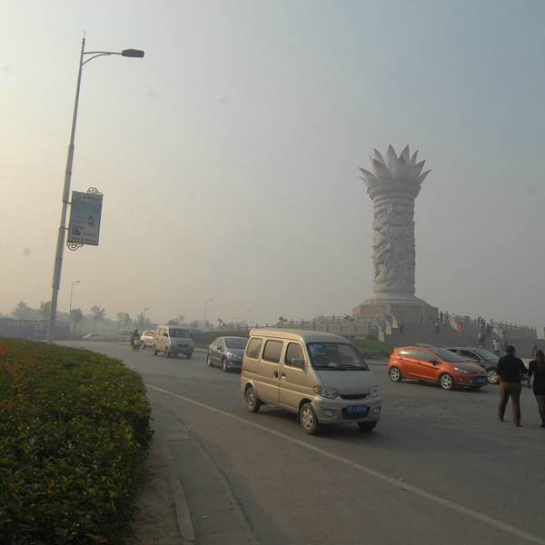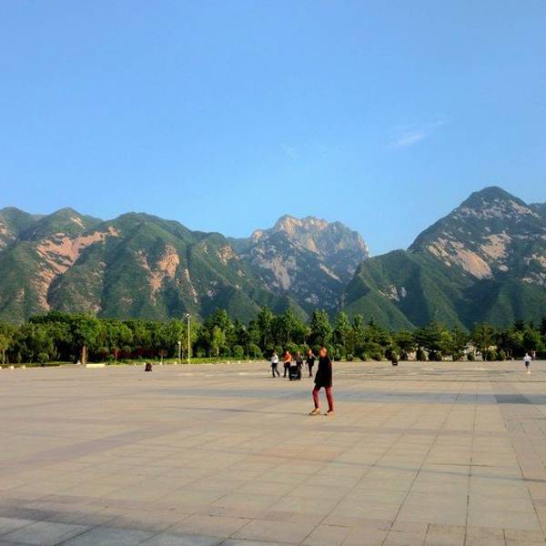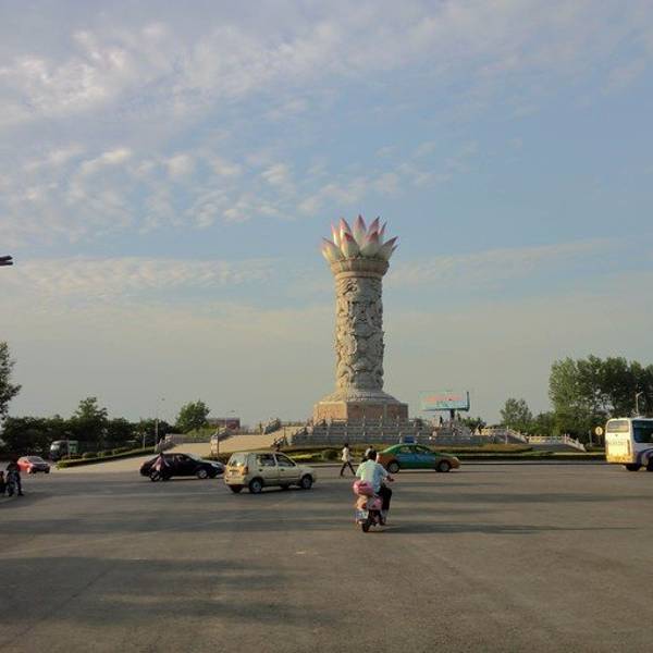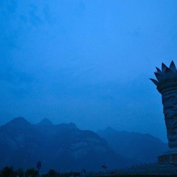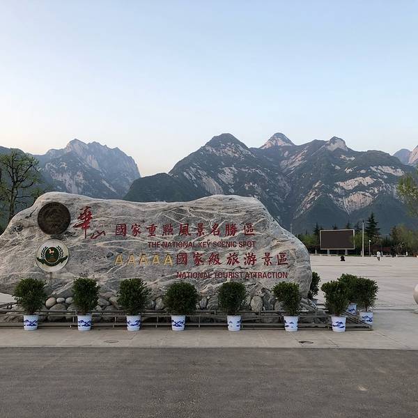 华山生态广场在华岳大道的尽头,巨大的宝莲灯造像矗立在石阶上,异常雄伟壮观,是地标性的建筑,在雕像的背后,就是巍峨的华山。广场很大,分布着停车位、公厕、游客中心,同时这里也是进入华山景区的购票处。