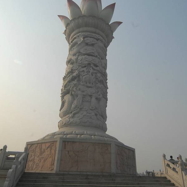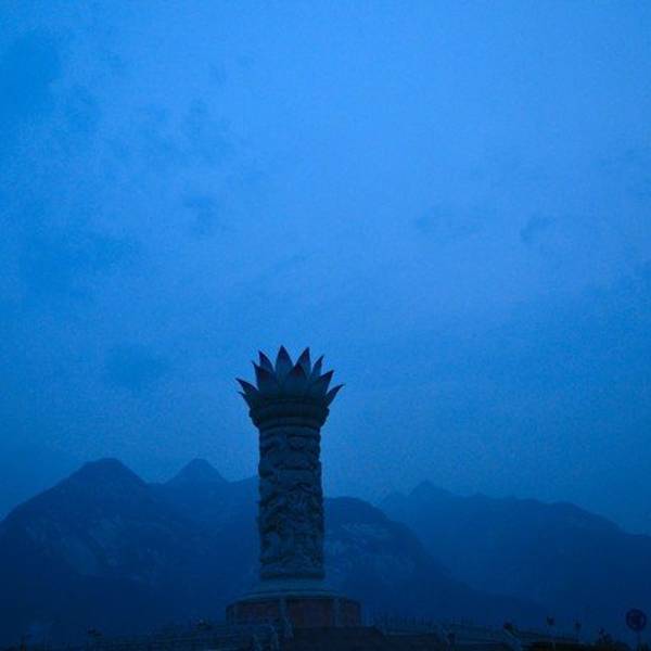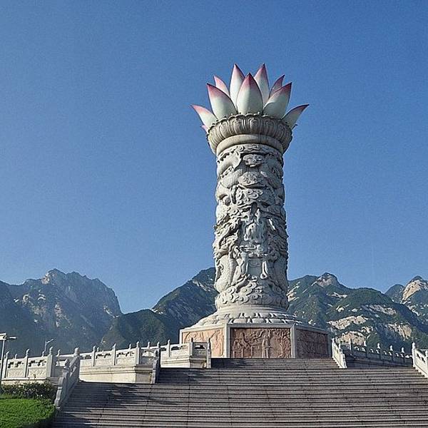 华山生态广场内巨大的宝莲灯造像矗立在石阶上,异常雄伟壮观,是地标性的建筑,在雕像的背后,就是巍峨的华山。