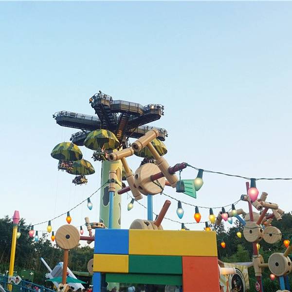 这是迪士尼里面比较刺激的地方去,远远就听到一阵阵惊叫狂呼,进去一看 是刺激游乐项目。高空升降就是那伞兵降落的样子,升高了突然失重下降,心都提到嗓子了。还有那些飞舟啊什么的,就是心跳的。老人小孩不适合,这里人相对少,没有怎么排队。