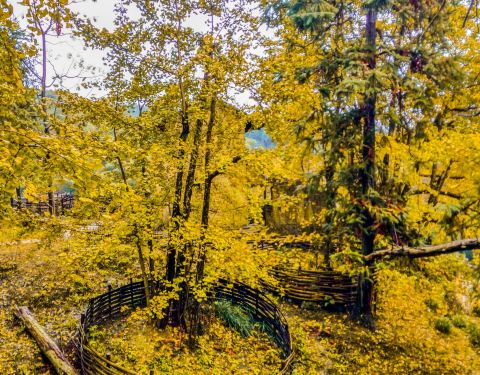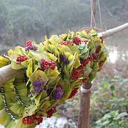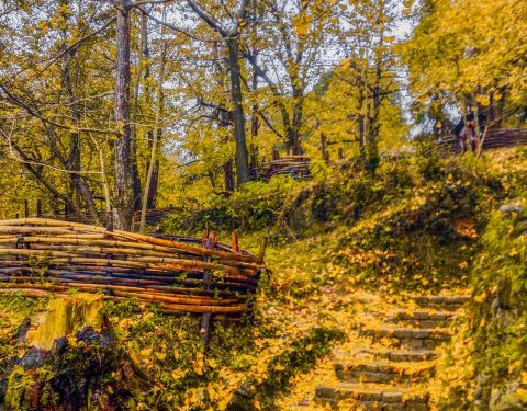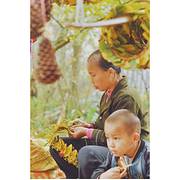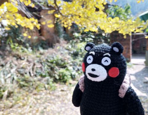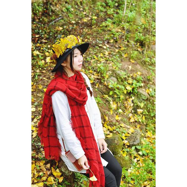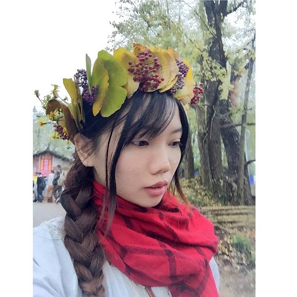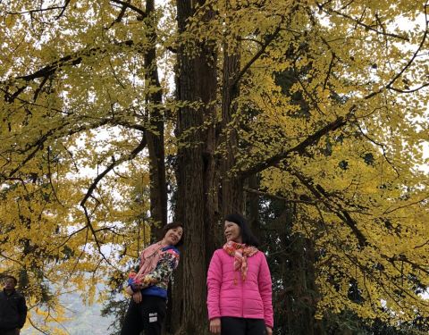 在景点的两侧都会有当地村民摆摊,卖点土特产,手工做些银杏叶头饰,我也帮衬买了一个在山顶坐了一辆面包车下山,回旅馆吃过早餐,收拾东西离店。到坪田下一个看银杏的地方—冯屋。
