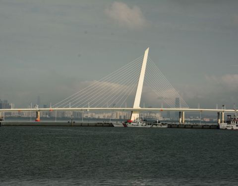 深圳湾大桥是位于深圳南山区连接香港的一座现代化斜索拉桥,全长有近五公里,有点S形的形态,在深圳...