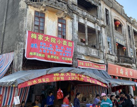 梅家大院(又名汀江圩华侨建筑群),始建于1931年,108幢骑楼建筑呈长方形排列,鳞次栉比,且每一幢的外观都各不相同。骑楼群中间还留有40亩专供商贩摆卖商品的市场空地,俨如一座小方城,由于当时梅姓人居多,故有“梅家大院”之称。步入梅家大院,迎面而来的便是浓郁的复古气息,由于历史悠久,不少大楼外墙已经略为斑驳陈旧,更是增添了一丝沧桑感。不过,这里至今不乏生活气息,打麻将的、晒衣服的等等,不少居民也开始售卖一些当地特色美食与小商品,豆腐花、凉粉、芝麻糊等等。