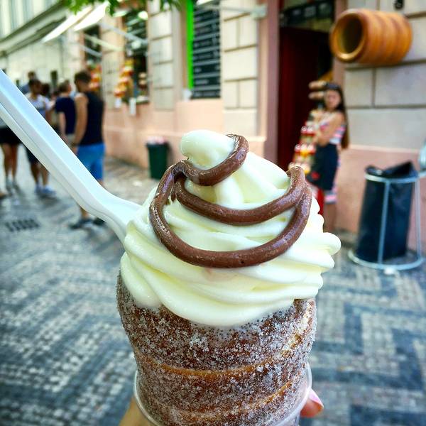 放眼望去,红屋顶有点CK小镇的影子,但却比那里宏伟辽阔得多。黄金巷位于布拉格城堡内,是一条受到保护的中世纪风格的小巷。其街名来源于16世纪的炼金术师,传说他们想在这里炼制黄金。整条街相当精致可爱,具有童话般的外观和柔和的色调,小巧的门和窗,低矮的屋顶和许多烟...黄金巷位于布拉格城堡内,是一条受到保护的中世纪风格的小巷。其街名来源于16世纪的炼金术师,传说他们想在这里炼制黄金。整条街相当精致可爱,具有童话般的外观和柔和的色调,小巧的门和窗,低矮的屋顶和许多烟囱,像极了小人国。目前,这里设有各种画廊、商店和展览。其中有一个【冷兵器展览馆】 非常值得一看~看似狭小的空间却别有洞天,拾级而上,可以参观到各种冷兵器、铠甲、甚至刑具,还有各式纪念品售卖,很是特别。另外,著名的捷克犹太作家卡夫卡在这条街的第22号公寓租住了两年,也使得22号公寓成为了一个特别的景点。“小人国”一般的房间~从城堡区出来,有一片宽阔的观景位。放眼望去,红屋顶有点CK小镇的影子,但却比那里宏伟辽阔得多。继续向下走,有一排售卖食品的小窗口,就在那里第一次吃到了在布拉格最爱最爱的甜品。后来才知道,这种“面包卷冰淇淋”叫“塔塔蜜”,是捷克的一种传统美食,是用特制的面粉发酵后的长条型面团一圈圈地卷在长棍上烤制而成,中间空心,呈筒状,内壁加上巧克力酱,外圈则用肉桂粉、杏仁粉、核桃粉、椰子粉、坚果等多种香甜辅料包裹。在布拉格的这几天,走过的每一条大街小巷,都能看到塔塔蜜在售卖。不同店家的面包口味、冰淇淋口味、配料口味略有不同,五花八门。酷爱小甜点且偏爱肉桂口味的我,简直对这种甜品毫无招架之力!吃饱喝足,上午的景点也已经参观完毕~于是回酒店小憩,养足精神下午继续~ 展开