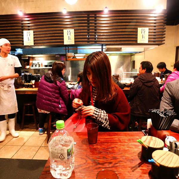 没有图片,完全看不懂的自动拉面售货机,店里的小哥都不懂英语的。幸好有个台湾同胞帮我们解释。一双的店,就这么大。牌子上的替玉是加面的意思。我们不知道随便点了两份面和一份5个的饺子,2000門,后来再次跟一兰比较,他们家的价格是便宜不少。替玉一双是100門,一兰是200門。当然一兰的店面和服务比一双好,细节也更到位,但是一双人气也很佳。晚上说饺子一般,确实,250門,就当尝尝。拉面来了。一双的特点是汤底是猪骨汤,非常浓郁,能感受到猪油的存在,所以也就绸一些。很特别,跟一兰不一样,跟国内的更没法比,但我觉得完全没有游记里说的秒杀一兰的底部。我可能更认可一兰,虽然一兰贵一点。溏心蛋,我很喜欢吃日本的这种蛋,(完了,又肚子饿了。。。晚上十点了),不过记得一个好像是6块多人民币吧,有点贵。。。不过日本的物价就这样了接地气地交了一份替玉,100門付现金。 其实我觉得是杨先森看到我们拼桌的旁边两个日本男人都加了面,他才想加的。。。