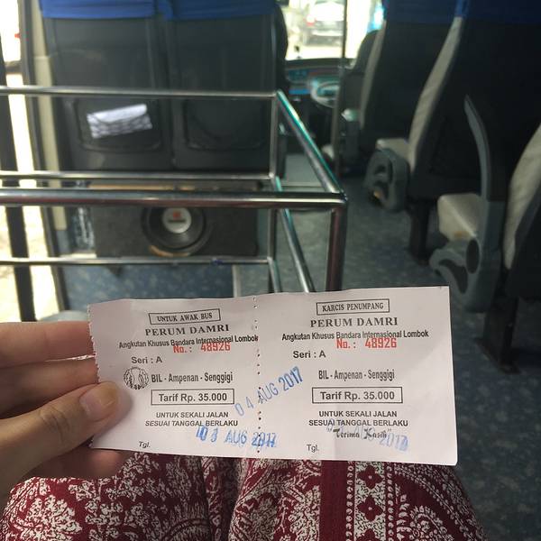 之前在网上查了下签证信息,还有看到说龙目岛不像巴厘岛对中国护照免签的说法,还在那边很辛苦的准备了35美丽的零钱当签证费,事实证明,龙目岛也是免签证费的,而且不是落地签,只是填写一张入境表格而已,大家请参照图片中的说明。建议下飞机以后先过境,再上厕所啥的,这样会比较节约时间,不用排队。机场外观到达机场之前查了下,网上没有关于龙目岛机场大巴的信息,大多数都是关于包车的,那我就在这里介绍下吧!龙目岛有机场大巴么?还是只能找接机或者打车?答案是有的,图中就是卖机场大巴车票的地方,非常明显,在过关后是必经之路,只是不知道为什么买票的人很少。大巴会停几个站,对游客来说只要知道它是去圣吉吉的就可以了。嗯卖的大叔说,可以给你们这个买票点拍个照么?我会帮你们做广告。大叔很认真的摆了个pose lol所以去圣吉吉的车票只要RP35千,相当于软妹币才18不到,包车或者酒店接机可是在RP350千的价格啊,差距还是有点大的,特别是对我这种一个人旅行的宝宝来说,买了票以后出了机场大门,就会有人从售票窗口把你带上大巴,没有的话拿出手上的车票甩两下撒,上车后发现,坐大巴的全是当地人,当地人陆续下车,最后到圣吉吉那一段是霸气的一个人包的车。大巴的沿途风景