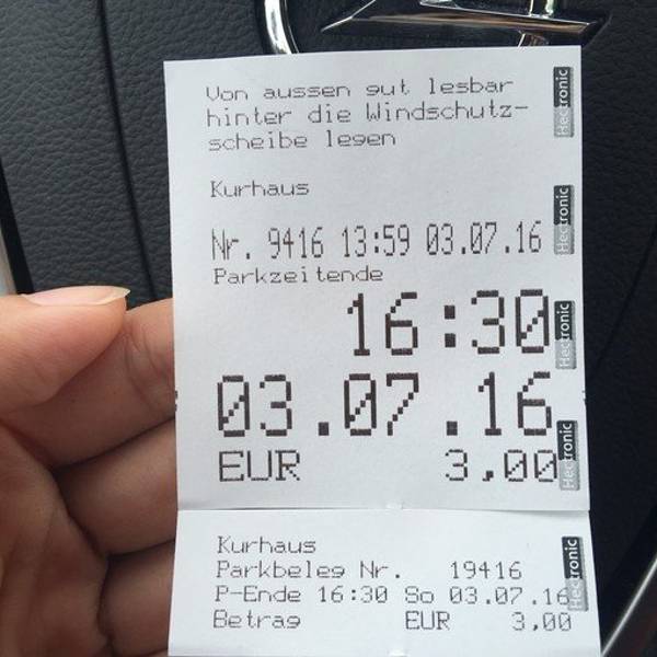 而我要说的是,在这里,是我第一次用自助停车缴费机。旁边停了一辆几个中国哥们儿的自驾车子,他们应该也是头一回,不知道怎么用。他们前面有俩只会英文的姑娘。赶快跟老爸说让他挨车里等着,我去观察。那俩姑娘先把机器调成英文的,然后塞硬币,塞多少,上面屏幕会显示能停的时间,脚着够使的,就按绿键,立马机器打票出来。。。。。。原来如此简单。。。跟网上攻略说的一样。拿钱包去,那几个中国哥们儿还在旁边观察。我心说。。。这不是挺简单的么?还看个什么劲儿?于是我很潇洒的向前一步,塞了一个1欧的,看看时间,不够,又塞了个2欧的。到16:30,那就是能停俩多小时,嗯~~~够了。绿键打票。拿着票,再次很潇洒的走开。那几个中国哥们儿跑去机器前面研究去了。