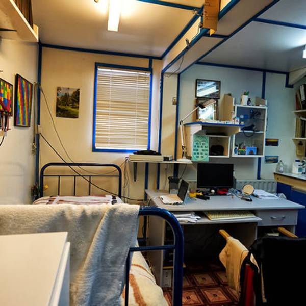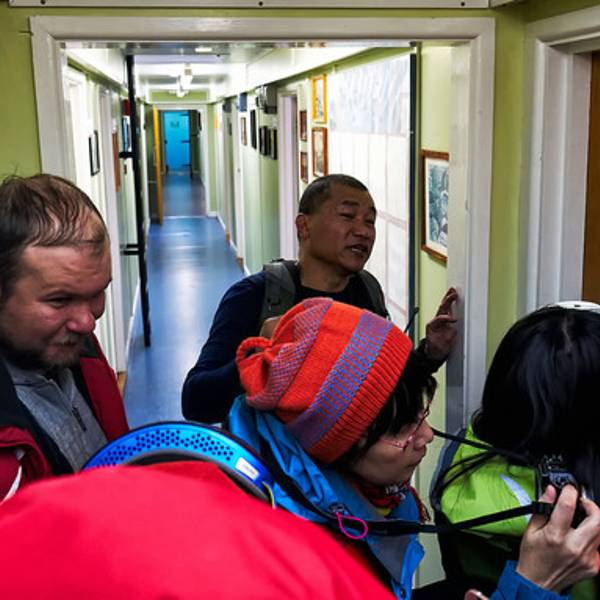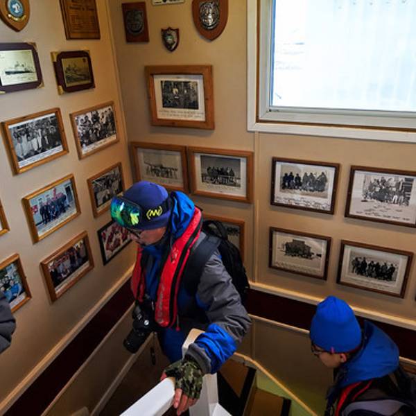 乌克兰的科考站主体建筑共有上下两层。两层之间通过一处转角楼梯连接。楼梯的墙壁上贴满了科考站从创建伊始到现在的照片。