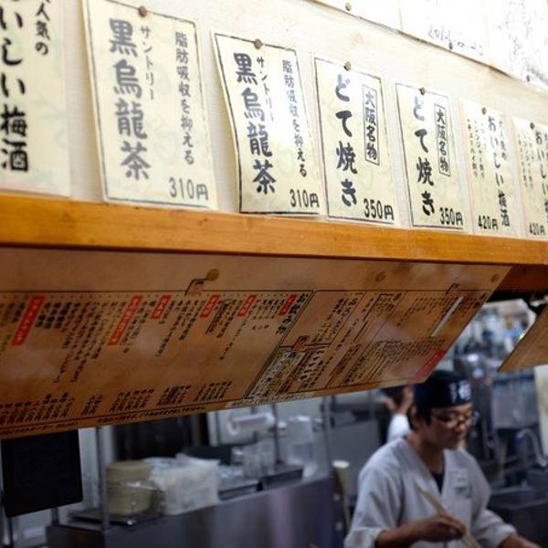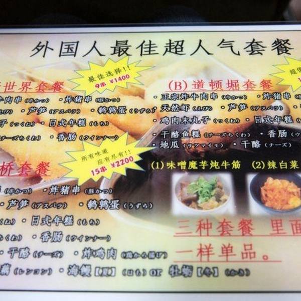 蘸了恶老板特制的酱汁,其风味清爽回味,绝对不会觉...元祖串串烧是一家拥有大概90年历史的老店,据说道顿崛这里的生意极好,晚上九点钟了,吃客还在门口排队,导致我们望而却步。今天就要离开日本了,排队也要吃。