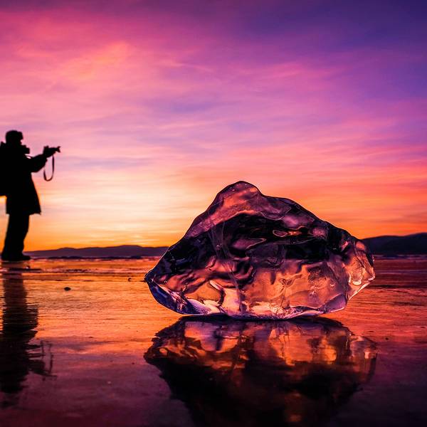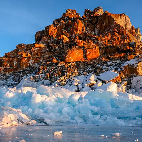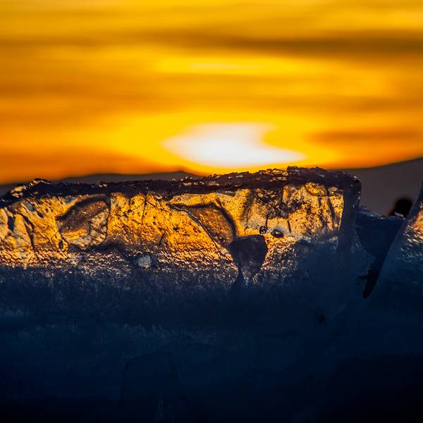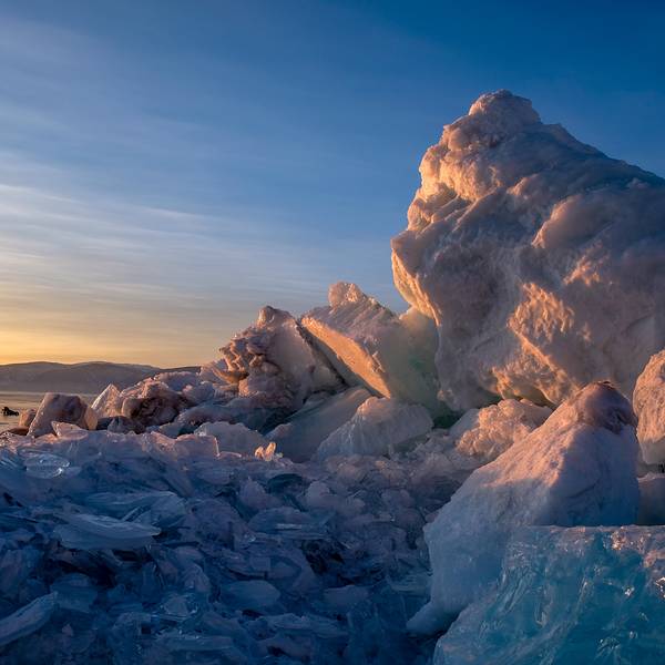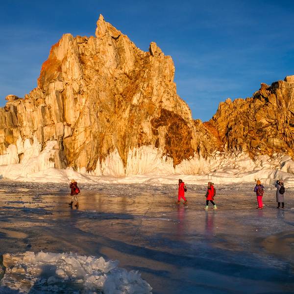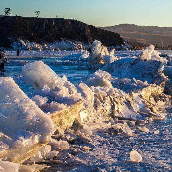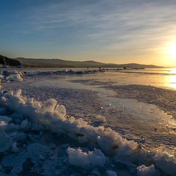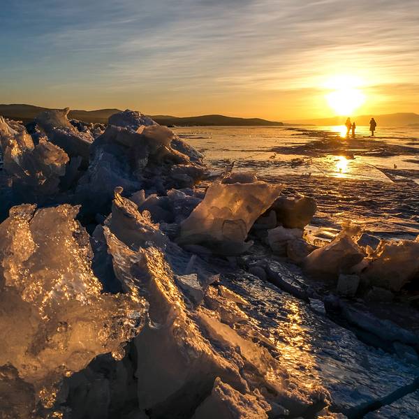从奥利洪岛南线回来,正好是拍摄日落时分,我们来到萨满山脚下观赏和拍摄。萨满岩日落被称作世界十大最美日落地之一。日落中的萨满山未完全冻结的湖水,将碎冰推向已冻结的冰面,形成广阔的碎冰区,无比壮观。萨...