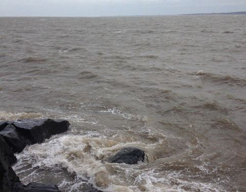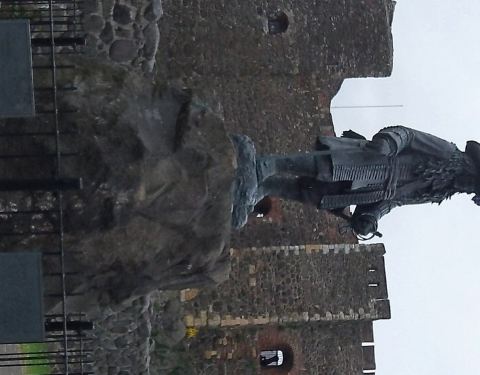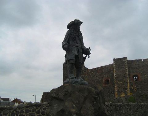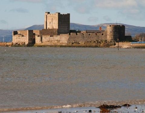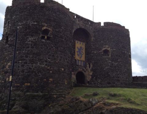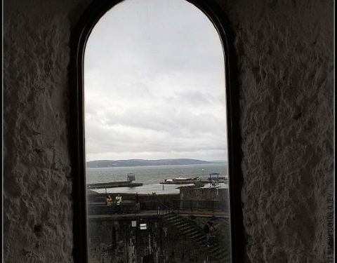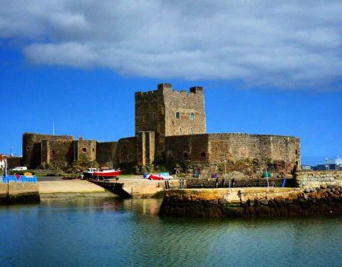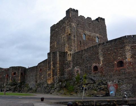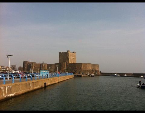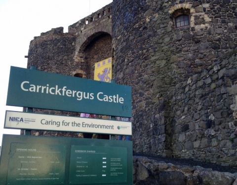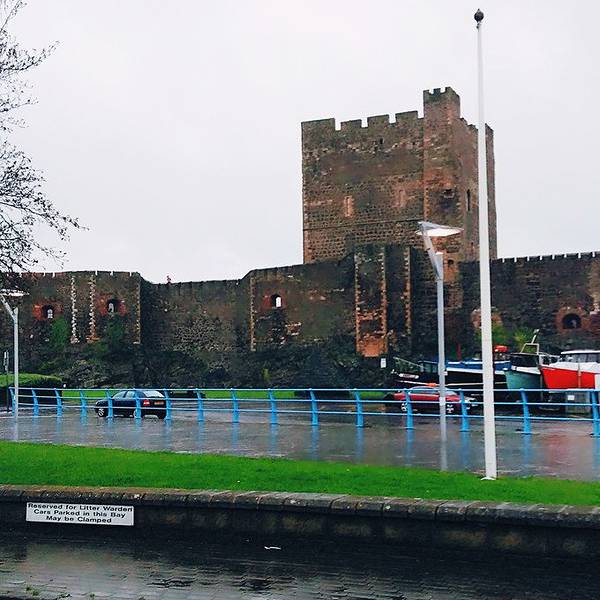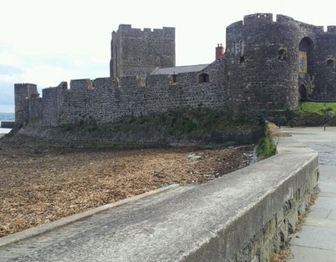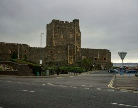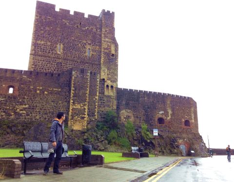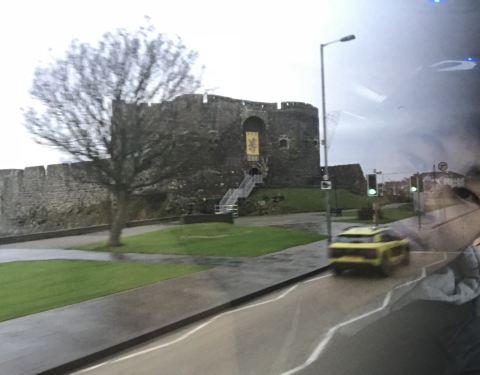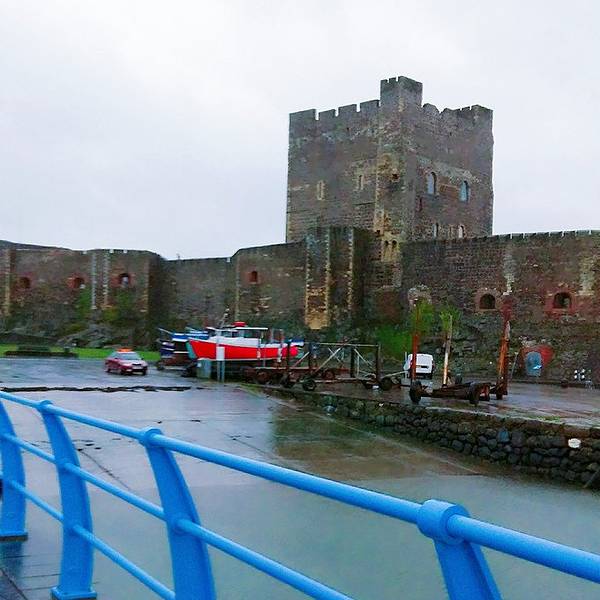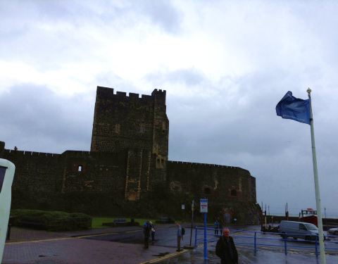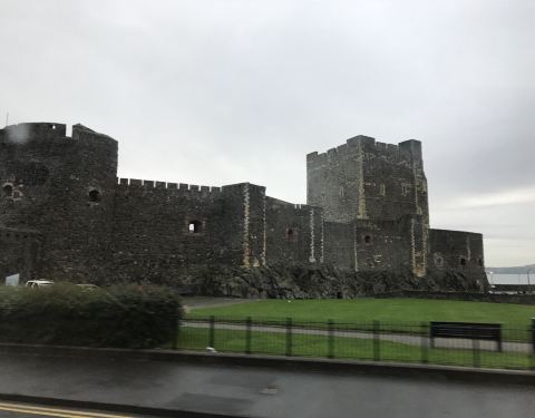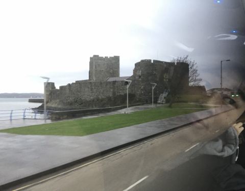 出发后经过了和平墙,但是因为下雨+天暗+我坐在另一侧,所以压根没看到。出城后半小时不到就到了一个地方下车,就是卡里克弗格斯城堡。卡里克弗格斯城堡是爱尔兰最古老、保存最完好的诺曼式城堡。始建于1180年,由当时的该地的征服者—John de Courcy下令建造。并在之后的几个世纪大规模扩建和加固。它立在一个类似服务曲的旁边,一面靠路一面靠海。这时正是风雨最大的时候,打伞完全撑不住,大风能够肆意蹂躏你的雨伞,在英国,雨伞真的是消耗品。下车不到5分钟我的裤子全湿,就草草拍了几张就回车上了。城堡的另一面是大门,能不能进去我也不知道,当时完全没心思在外面呆着了。