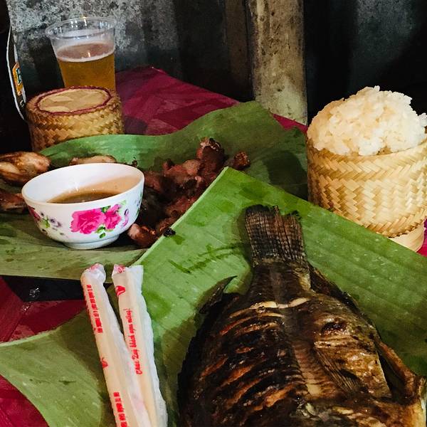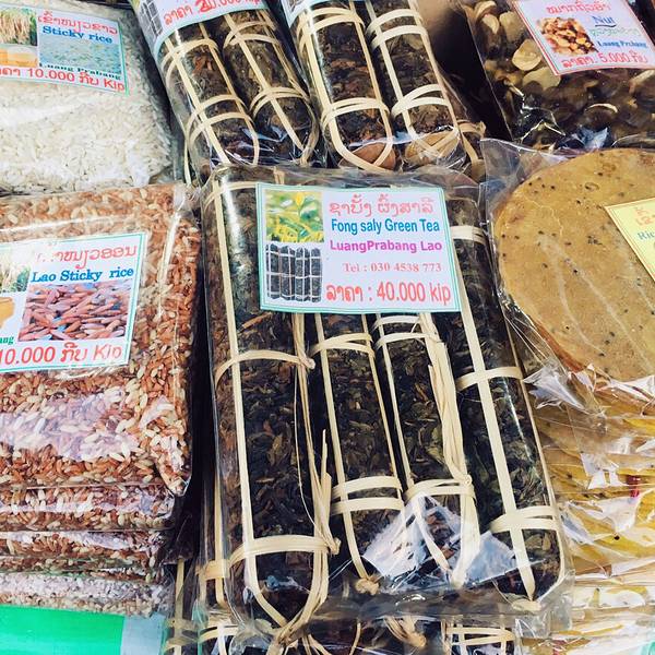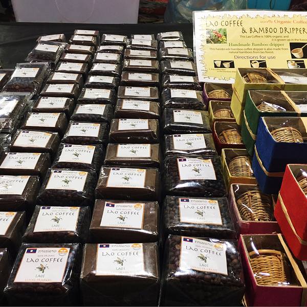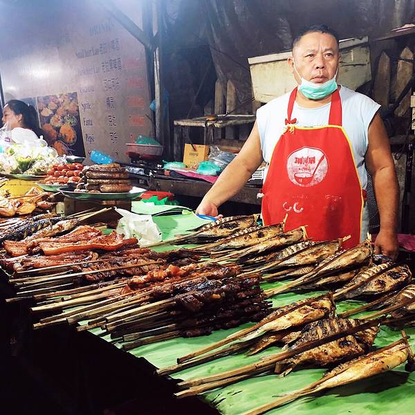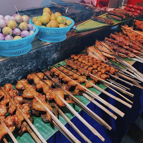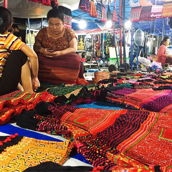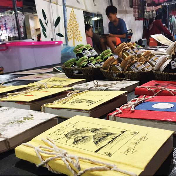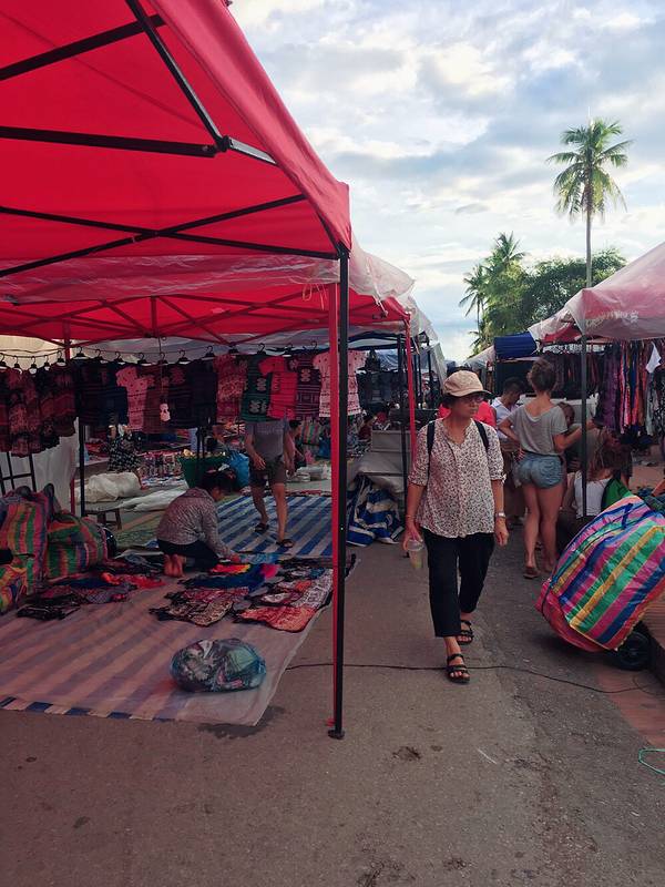 琅勃拉邦的夜市如同流动的宴席,从王宫博物馆门前的路口到几公里之外的街道,排满了蓝红白三色的帐篷,不是印象中人声鼎沸的喧闹夜市,而是平静和善的买卖,摊主多为当地妇女,抱着刚出生不久的孩子,夜市上的商品大同小异,价格也相差无几,大都物美价廉:印染有老挝传统纹样的布料做的各式衣物,手工纸做的灯罩,木雕的大象,还有一些本地产的茶叶和咖啡,喜欢购买手办的人儿可以放心购买。入手一条本地特色的筒裙。摊主的羞怯与印象中的商贩形象大相径庭,是我在其他市场从没有感受过的气氛,没有吆喝声,挑半天不买,也不会恼怒抱怨,反而让人不好意思辜负这样的好脾气。一些摊位的主人都是年纪很小的孩子,最多十几岁,卖手工制作和包装的咖啡和茶叶,手工绣制的小手工艺品,我入了几个可以用来放护照或化妆品的小包,上面修的图案都是动物,非常童真可爱,远没有made in China纪念品的工整,针脚很拙,看得出是手工绣制,交谈中得知他们都是一所学校的学生,这些都是志愿者们教他们制作的。夜市旁是美食一条街——小吃天堂,规模并不大,在那里逛吃的也不乏本地人,烟火缭绕的夜宵市场,大盘大盘的熟食,摆得齐齐的一整条一整条的烤鱼,大都是河鱼,只用盐去佐味,肚子里放上柠檬用来去腥,保留了鱼肉的原汁原味,蘸上特色的酱汁,风味相当独特。一种无形的抚慰人心的气场。找个老式“大排档”坐下,我和小红一人来了盆炒粉,配上不知道什么的肉和蔬菜,看起来也挺丰盛,一瓶老挝啤酒够两人喝,看似平平无奇的老挝啤酒其实是世界十大名啤之一,闷热的夜晚喝上一口冰啤酒,大呼活着真好。