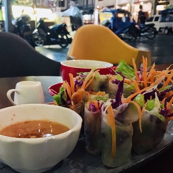 我坐在街角,吃晚餐,老挝茶配蔬菜手卷。