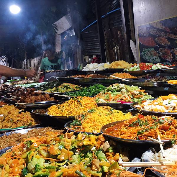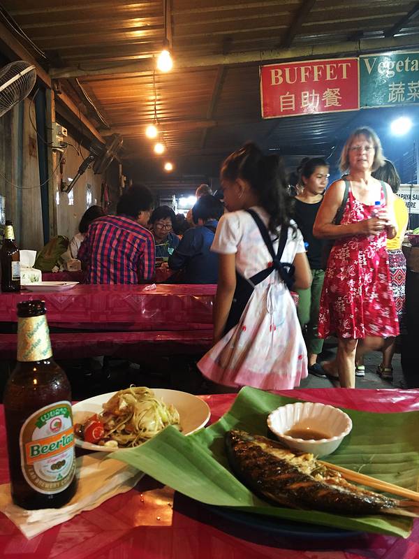 真是:无烟火,不人间啊!今天的晚餐:烤鱼,沙拉,老啤…隔壁餐桌上的米饭夜市上的素菜自助餐,生意超级火。