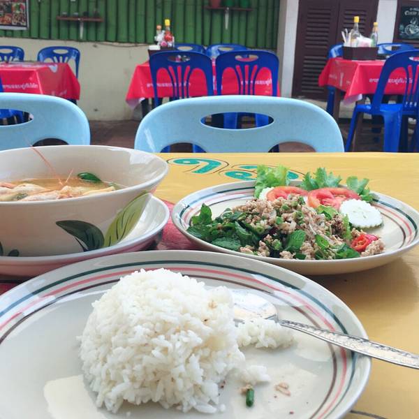 刚想着爬...中午,出去觅食。冬阴功汤, 炒鸡肉靡,米饭。店家老板的女儿正在午睡,小帐篷舒服又安心,神器啊!今天预报有雷雨,原计划是下午和几个韩国朋友一起拼车去光西瀑布玩的,因为天气原因,大家都放弃了。