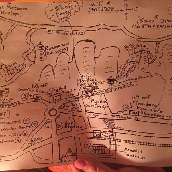 于是我们决定回去睡一会,晚上再去观景平台看美丽的日落。不错。节省了很多自己摸索路线的时间整个梅黛奥拉景区一共有6个山顶修道院。老板娘拿出手绘地图给我们讲解哪些地方值得一去,还有注意事项。节省了很多自己摸索路线的时间。