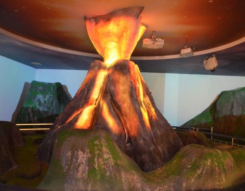 有各种火山石摆放在那里,还有模拟火山爆发的画面供游客观赏