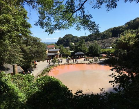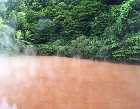别府八大地狱之一,和龙卷地狱在一起的,需要坐公交车去,红色的泉水热气腾腾的冒着烟,应该是富含铁质的水别府八大地狱之一,和龙卷地狱在一起的,需要坐公交车去,红色的泉水热气腾腾的冒着烟,应该是富含铁质的水,这里也有公共的泡脚池可以免费使用,走累了就泡一下,水温挺烫的,泡完很舒服,继续下一个景点。