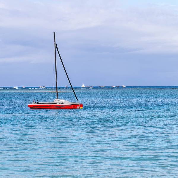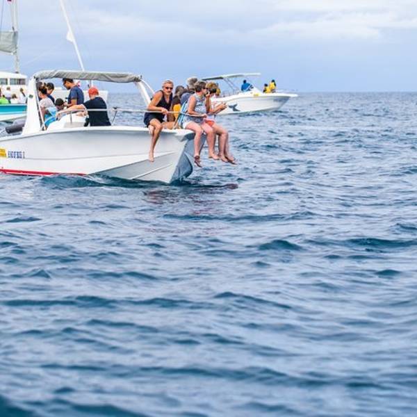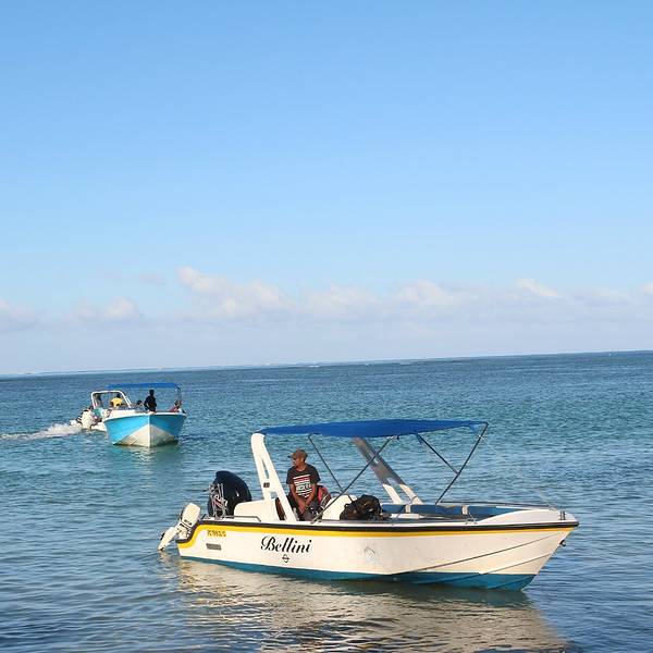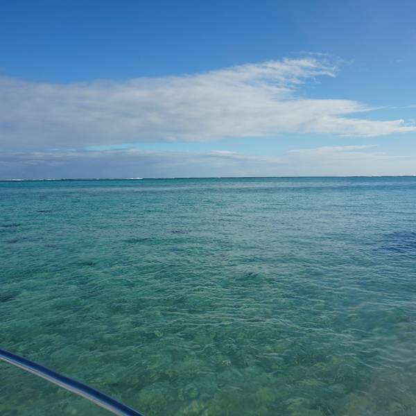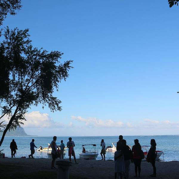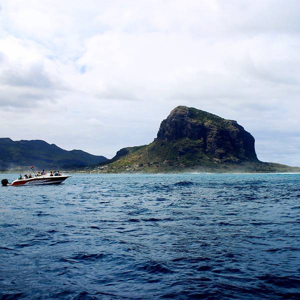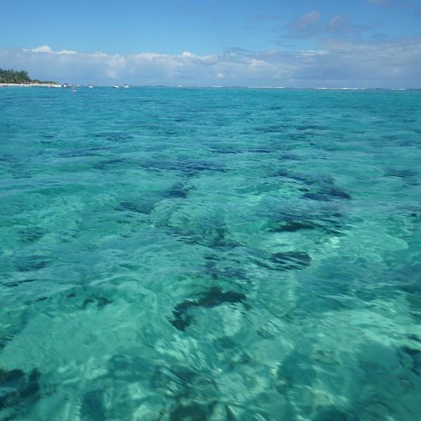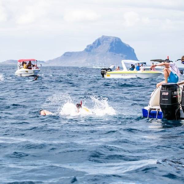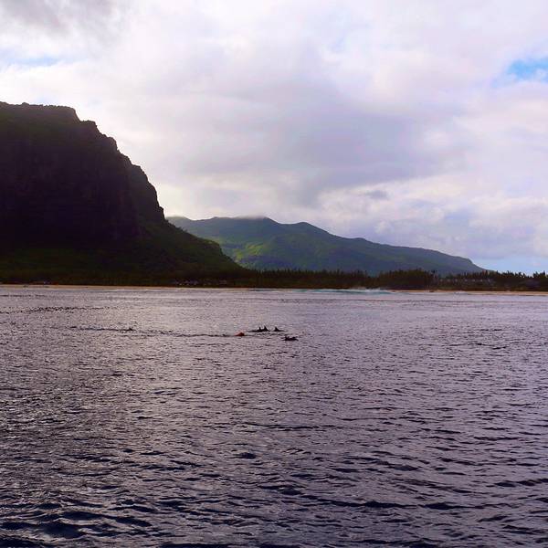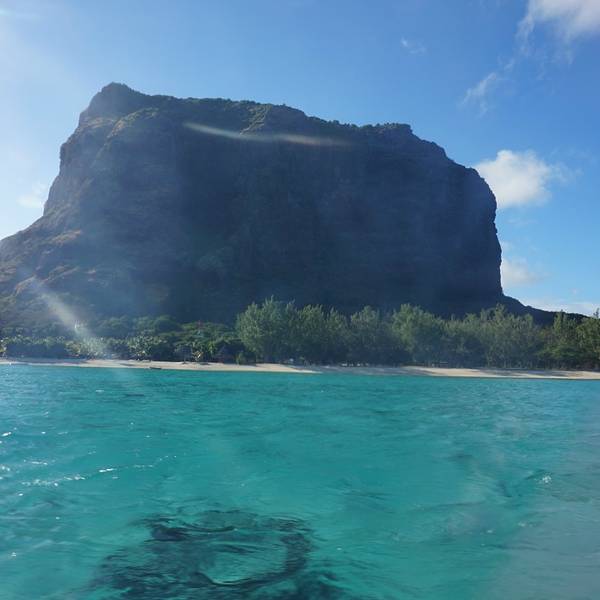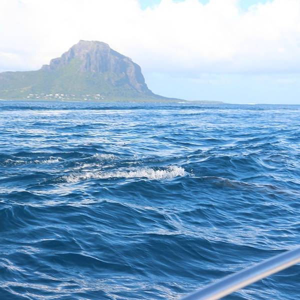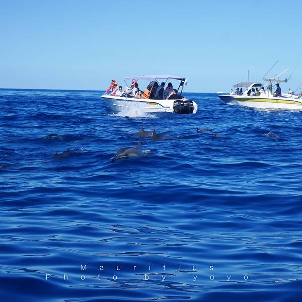 第三天,是个多云的早晨,我们被接到海豚湾,去追寻那群可爱的小精灵。在毛里求斯,你压根不用担心今天会看不到海豚,海豚是天天按着路线巡游,喜爱人类的它们,很乐意和人亲近。我们在岸边看到了接我们的快艇。几分钟后,我们抵达了海豚巡游的必经之处,我惊呆了,我从来没有看到过这么多快艇在海面等待的样子,像极了一场电影大片。这个活动明显更受欧美游客的喜爱,只见到他们轻装上阵,随时做好跃入海中和海豚共舞。整个场面充满了刺激和兴奋,快艇开开停停,大家都会朝着一个方向前进,如果等待几分钟没有看到海豚,就会继续行驶。一阵喧嚣之后,海豚出现了!快艇上的老外们激动的跳下水,和海豚一起游泳。别看水面上是几只海豚,那只是几只海豚宝宝出来透气,水下至少有几十只!我们的快艇上也有几个游泳健将,一到海豚集中的地方就穿上脚蹼直接跳下海。我们的导游也是个戏水高手,他和我们说,他跳水的位置正好有一群海豚游过,海豚和他都吓了一大跳,敢情他就是往海豚堆里跳啊!我真的真的是第一次看到这样的景象,整个气氛就是严肃紧张活泼朝上。我也并非只想呆在快艇上欣赏大家和拍照。只是苦于没有经验,压根没有准备脚蹼和救生衣。而且海豚湾水深40米,不是游泳健将真的要慎重。这里会有一对矛盾的地方,穿了救生衣能保证安全,但是快艇是随着海豚走的,一会就会离开,救生衣太重游不快,很容易掉队。追踪海豚的活动可不短,足足一个小时我们都在海面上换着方位,海豚也出现在我们视线中好几波。听说这里的海豚每天早上10点会“上班”。这是形容它们的作息规律。差不多40分钟后,海豚会向着远方游走。