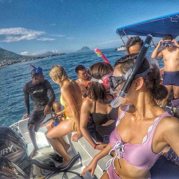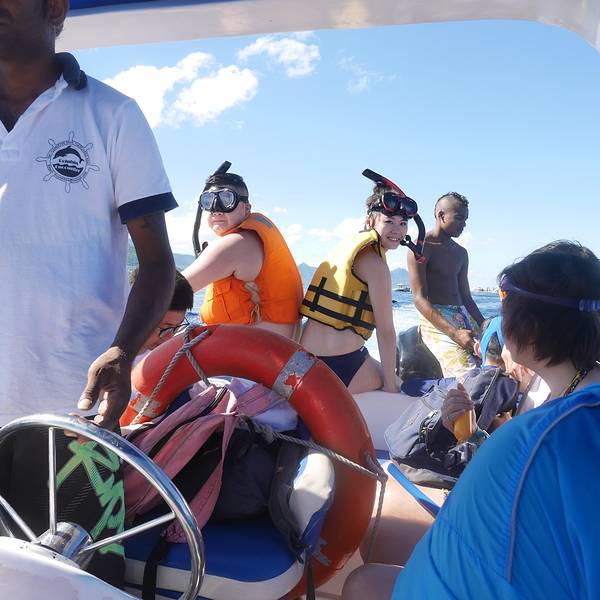 金骆驼 船长很给力,看到海豚,就带我们追,。我也下去了,不过没看到。除了看海豚,还可以看美女到毛里求斯,出海之一,就是来海豚湾追逐海豚了。导游告诉我们,这里的海豚每天早上都会到海豚湾觅食,所以只要时间对,那肯定可以看到海豚的。去海豚湾,可以提前在导游那里买行程,当然也可以在淘宝上面买,我...到毛里求斯,出海之一,就是来海豚湾追逐海豚了。导游告诉我们,这里的海豚每天早上都会到海豚湾觅食,所以只要时间对,那肯定可以看到海豚的。去海豚湾,可以提前在导游那里买行程,当然也可以在淘宝上面买,我是在淘宝上买的,淘宝上很清晰,有很多种套餐,各种行程的组合。由于我之前租车自驾游,所以我就选择了最简单的行程,自己到海滩湾上船点。我是一大早出发的,6点多吧,到上船的地方,时间刚刚好,可以看到人已经很多了,中国人,外国人,都很喜欢这项运动。没一会大家就上船出发了,协调还是很给力的哦。我们就是往这个上的方向前行,后来我才发现,这就是莫南山吧,瑞吉酒店就在这下面。出发的船很多,我们坐的就是这种最小巧可爱的,一行也就8-10个人。我想计调是有意安排,中国人和中国人一起,外国人和外国人一起的,我们一同出现的正好是成都来的,大家有说有聊的。出海阳光特别强,防晒霜一定不能省着用哦,而且一旦下水之后,要赶快再涂。。。男生一般都不注意这些,最后回国才发现自己已经毁容了。。