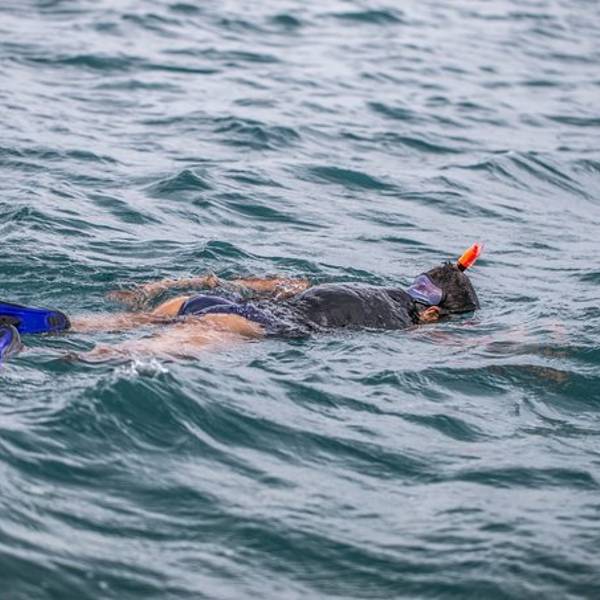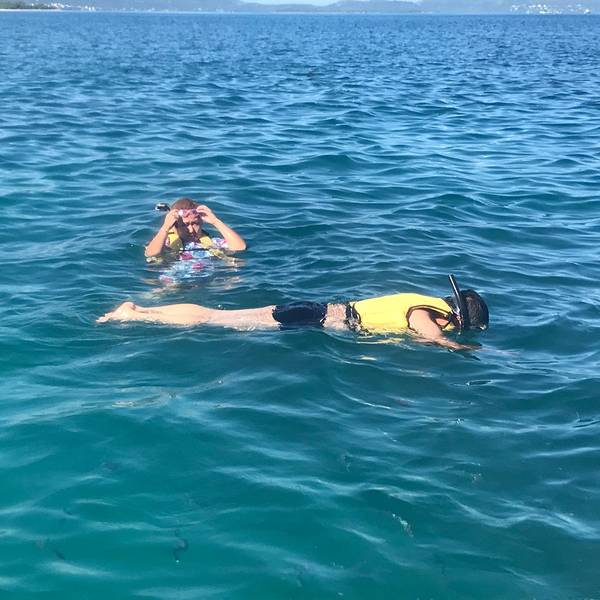 杨先森回来很兴奋的跟我说他看到了海豚,这是他第一次这么近距离的看到海豚,他觉得超酷,希望我能下去,可是。。。我的脚刚碰到水我就退缩了,真的好冷。。。还要担心没人看着我。。。之后一次下水,一姑娘本来在船头,之后跟sky说,“我想下去。”“好的。”“那你等会儿能在我旁边看着我吗?我不会游泳”“可以啊,来,我们准备,1 2 3 ,跳”导游下去了,这姑娘眼看着就要下去了,停住了,来了句“还是算了。。。”哈哈哈
