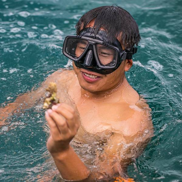 告别可爱的海豚宝宝们后,快艇会停留在近海十分钟,给游客们下去浮潜,我们的导游就是在这里给我们摘了一颗海生物。照片中那对法国夫妻的装备是比较专业的和海豚共游的衣服。鲨鱼衣,脚蹼能帮助游客更迅速的接近海豚和它们互动。容我再唠叨一句安全问题,导游和我说过,游泳不行就千万不要下海,真的有游客没有回来过,不要强行阻止海豚巡游,曾经有游客抱住一只母海豚不让它走结果被咬了一口. 如果要用相机捕捉健将们和海豚在海面共舞的照片,我是M档拍摄,光圈10左右,快门800分之一,ISO根据现场光线调节。 展开