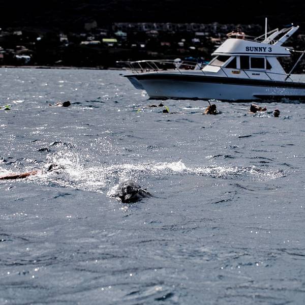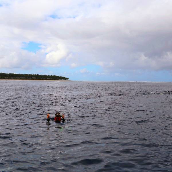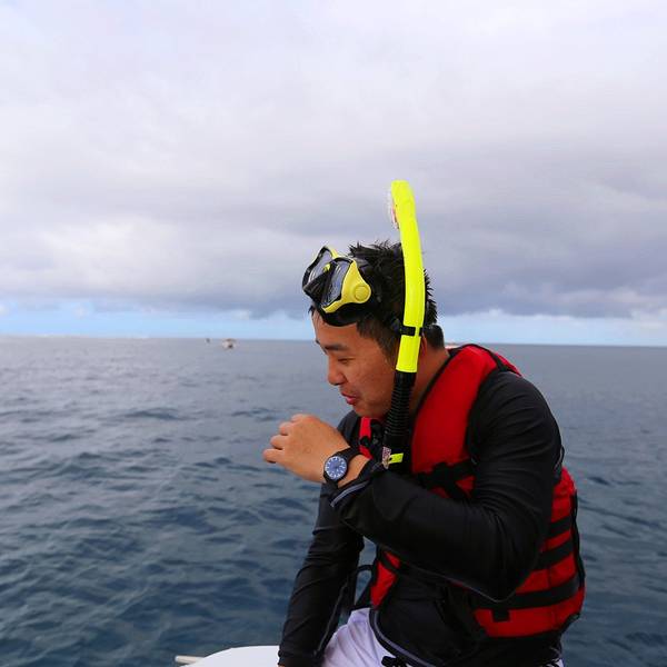 他跟那个没拿到救生衣的男生说,没关系,我们等下一批,我们会下去三到四次,我相信后面不会每个人都想下去的。。。(what?)他教了我们一些下水的技巧,比方说按住泳镜,尽量垂直跳海,而不是斜过来,跳的一瞬间屏住呼吸,在浮上水面的时候把肺里憋着的气一股脑呼出来,最后就是在他跳下去的三秒之内下水,不然海豚就游走了!
